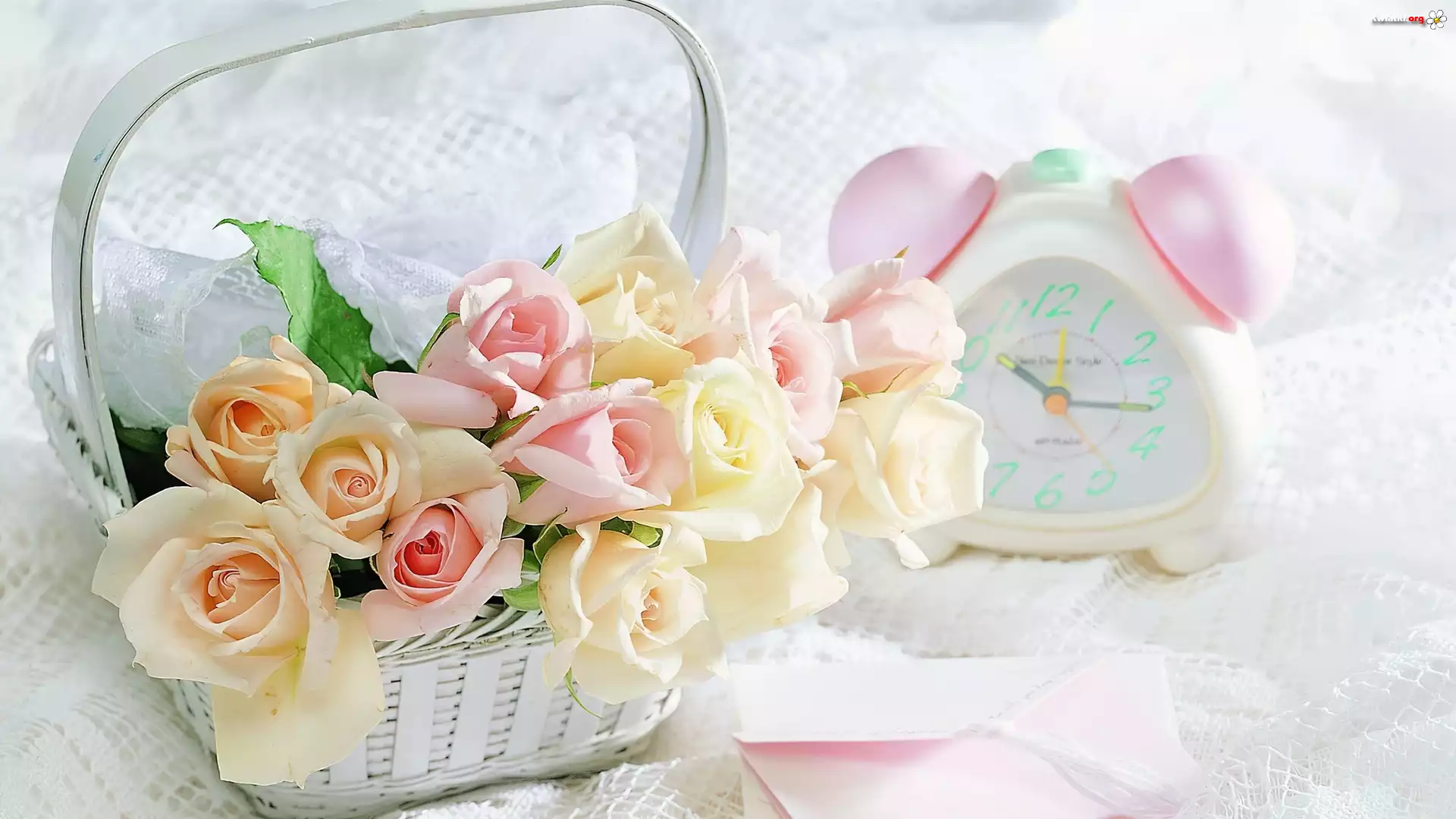 Kwiat Piękne, Pastelowe, Róże, Koszyk, Budzik
