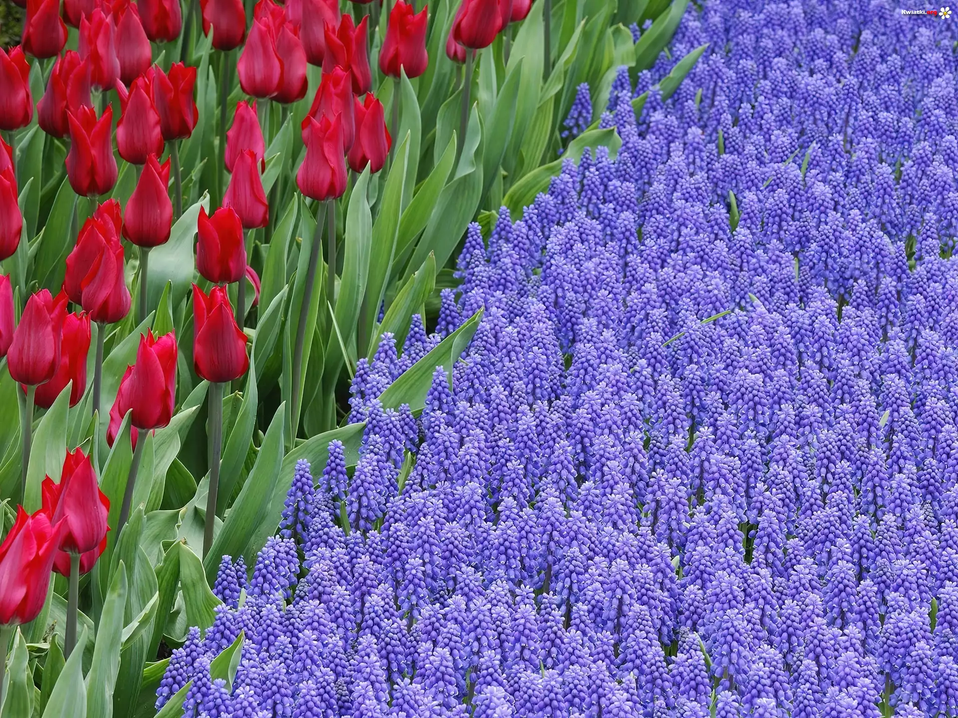 Kwiat Piękne, Kwiaty, Czerwone, Tulipany, Szafirki
