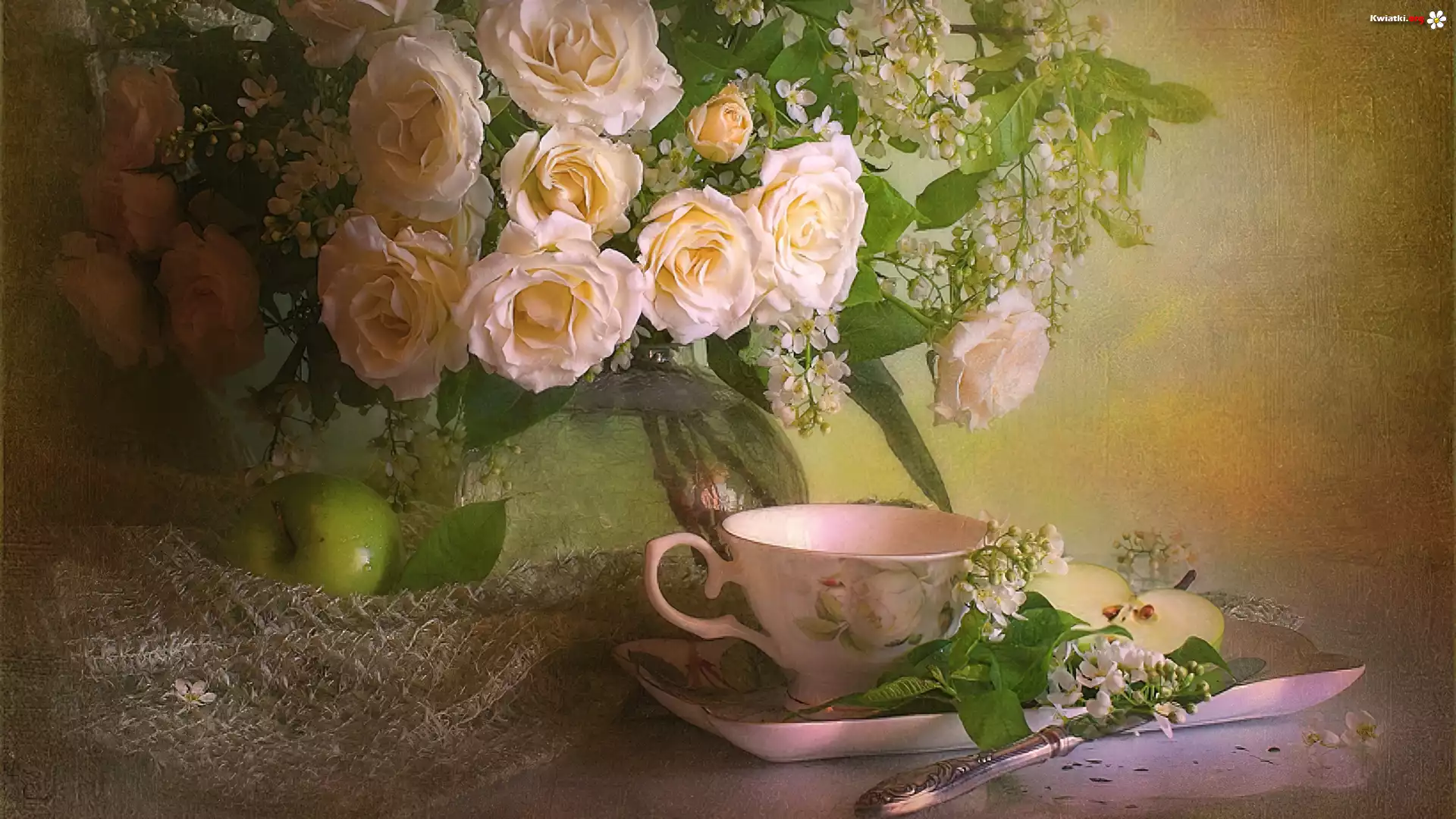 Kwiat Bukiet, Pięknych, Róż, Filiżanka, Jabłka, Koronkowa, Serwetka