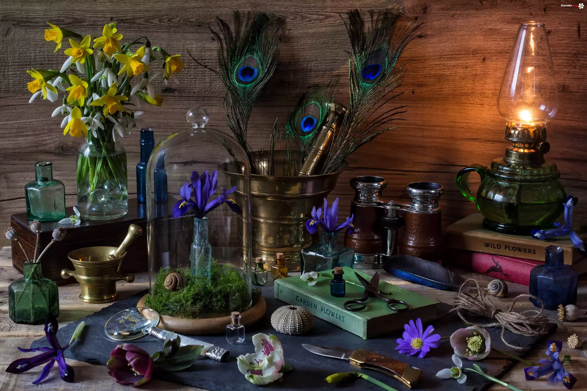 Kompozycja, Bukiet, Żonkile, Flakon, Lampa, Moździerze, Książki, Pawie pióra - Zdjęcia