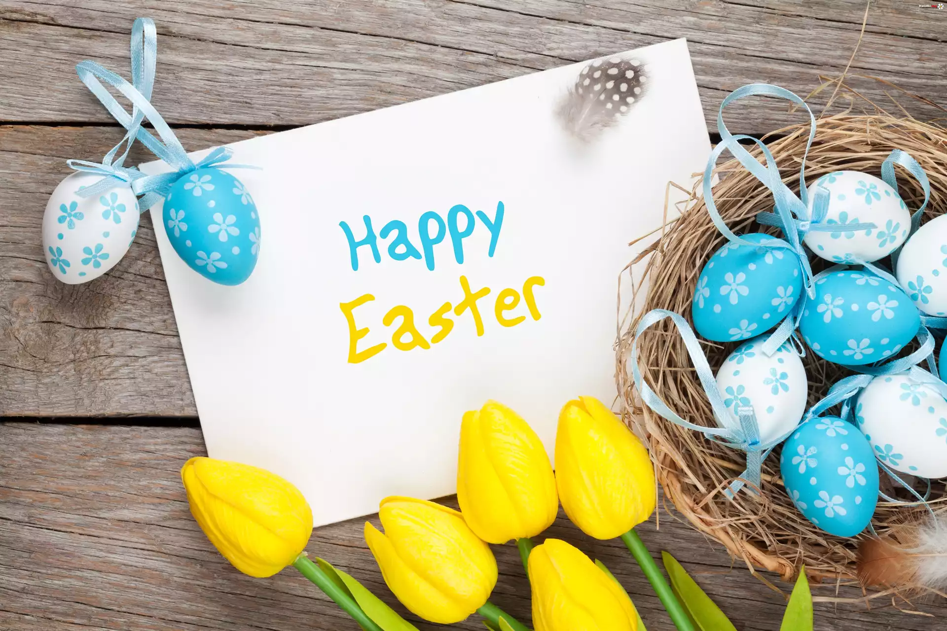 Kwiat Wielkanoc, Żółte, Tulipany, Koszyczek, Pisanki, Kartka, Życzenia, Deski, Piórka