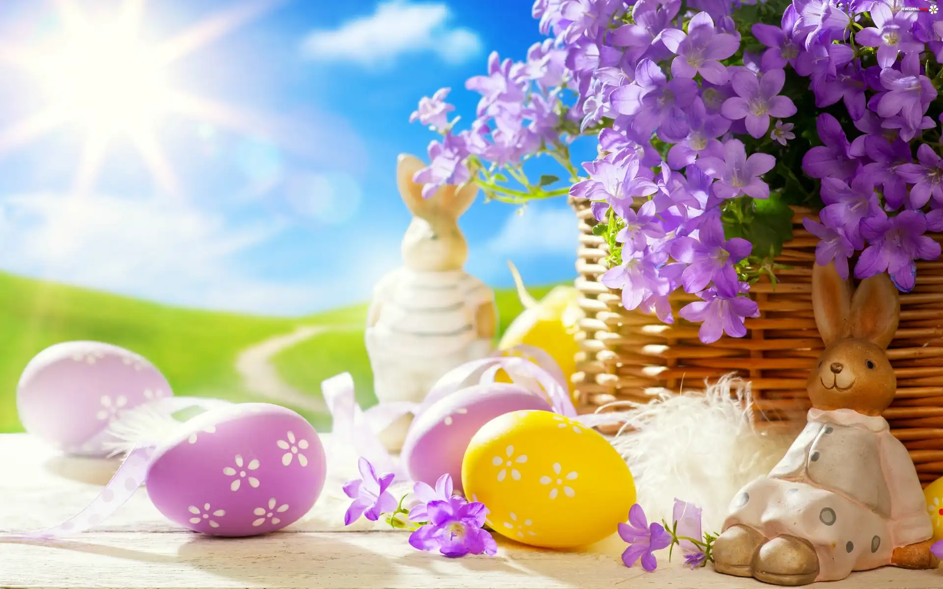 Pisanki, Zajączki, Kosz, Kwiaty, Wielkanoc, Kompozycja - Zdjęcia