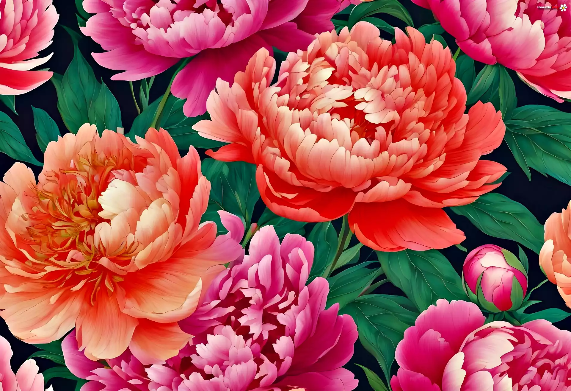 Czerwone, Różowe, Kwiaty, Piwonie, Liście, Grafika - Zdjęcia