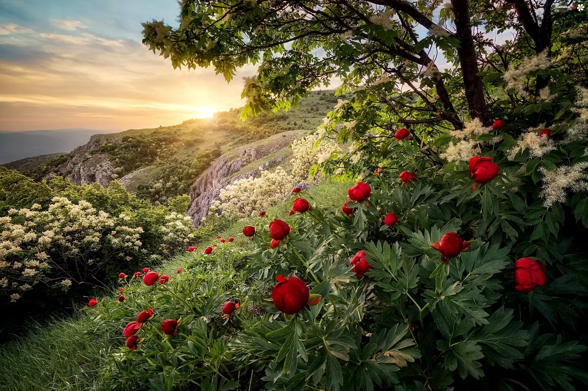 Kwiaty, Piwonie, Kwitnące, Drzewa, Góry, Wschód Słońca - Zdjęcia
