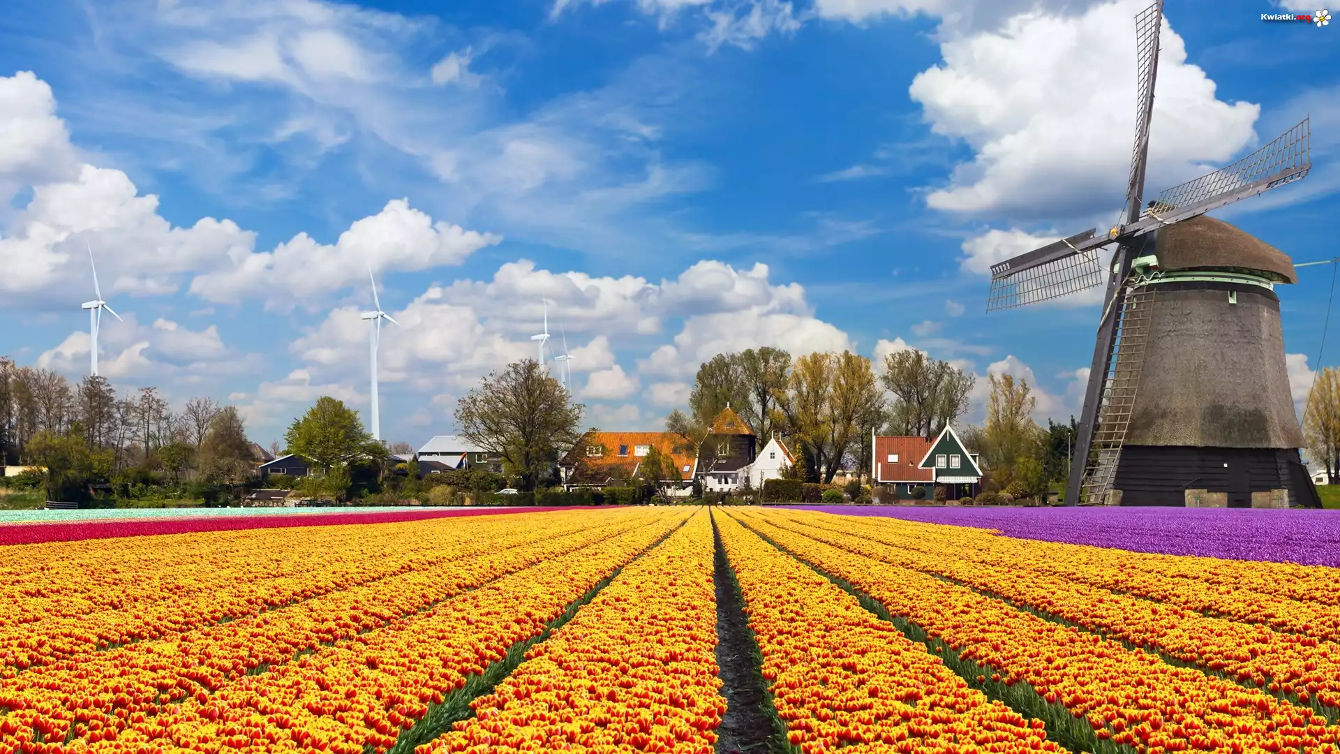 Plantacja, Tulipany, Wiatrak, Domy, Chmury - Zdjęcia
