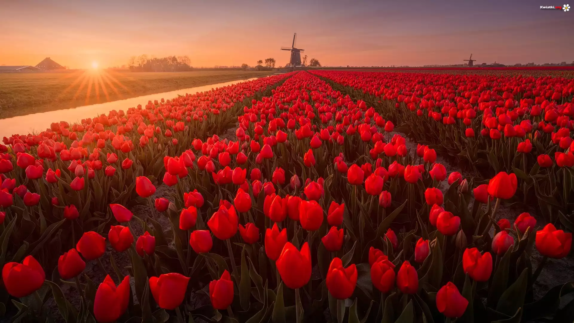 Kwiat Plantacja, Czerwone, Tulipany, Wiatraki, Wschód słońca