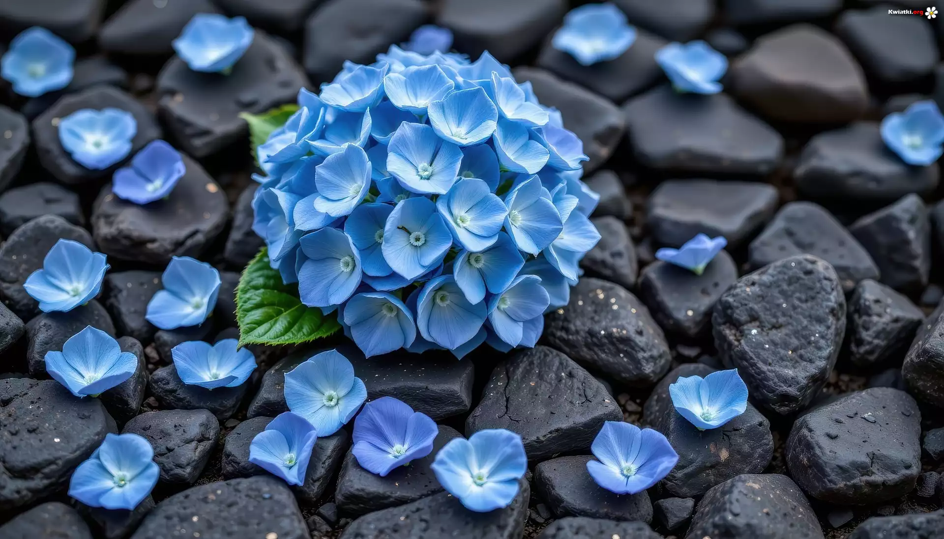 Kwiaty, Niebieskie, Hortensja, Płatki, Czarne, Kamienie - Zdjęcia
