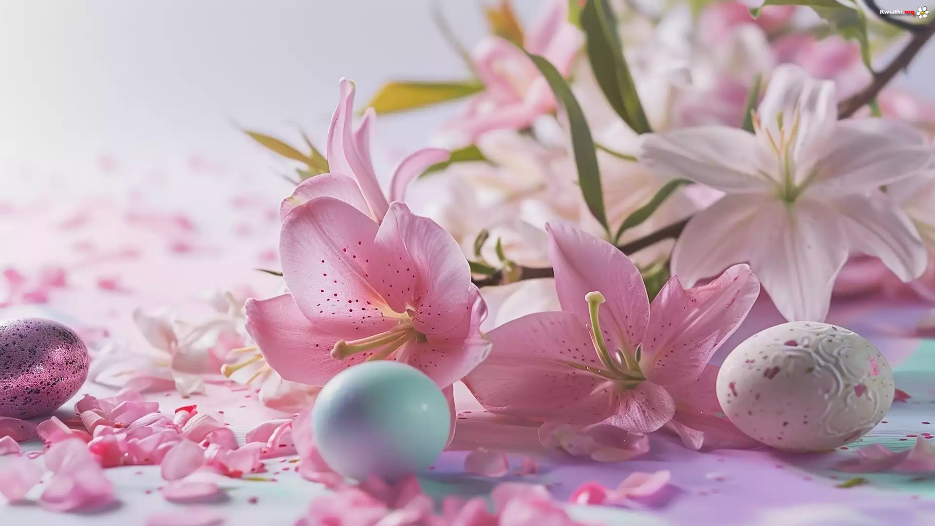 Kwiat Wielkanoc, Trzy, Kolorowe, Pisanki, Różowe, Białe, Lilie, Płatki