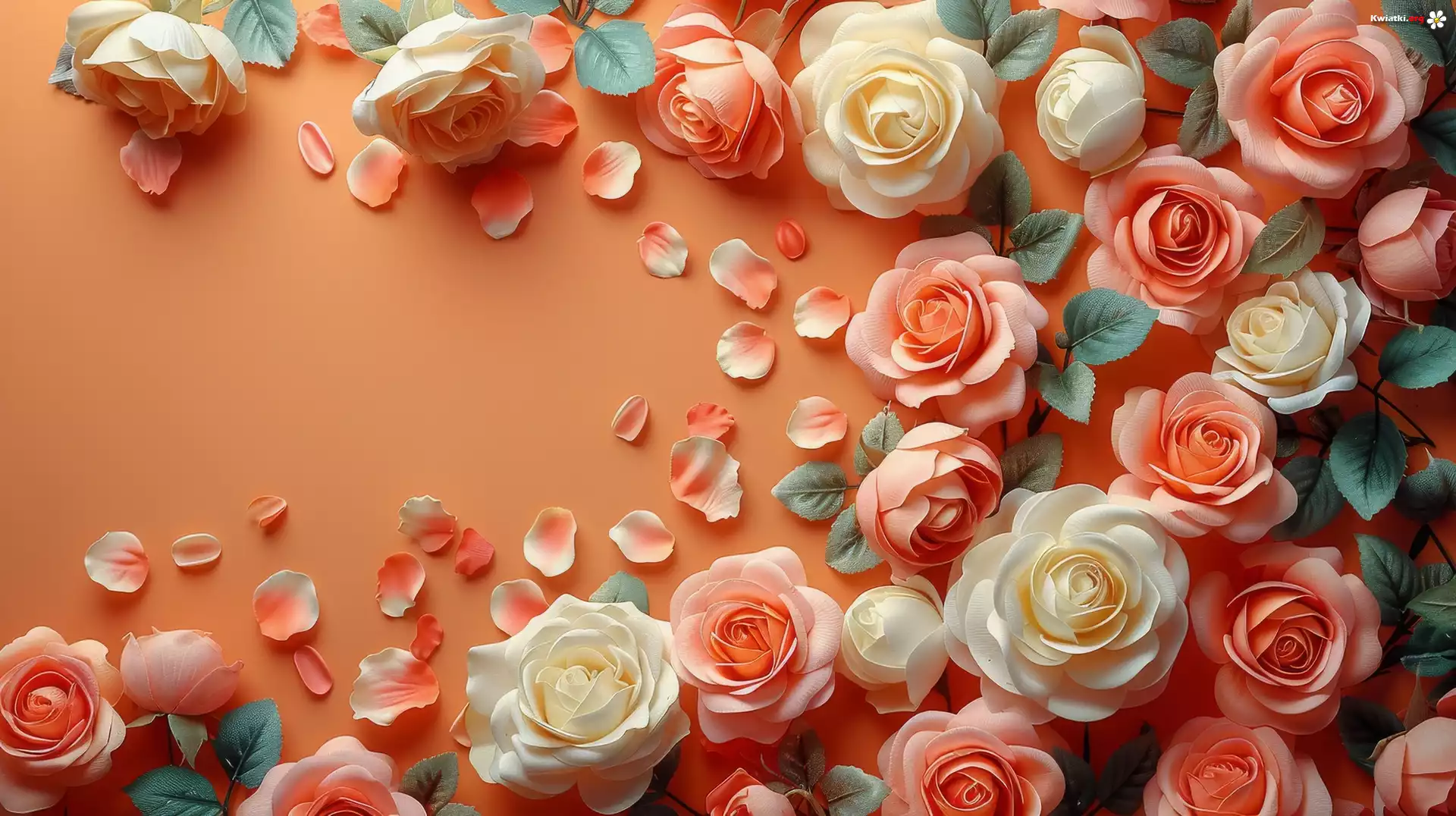 Białe, Pomarańczowe, Róże, Płatki, Listki, Tło - Zdjęcia