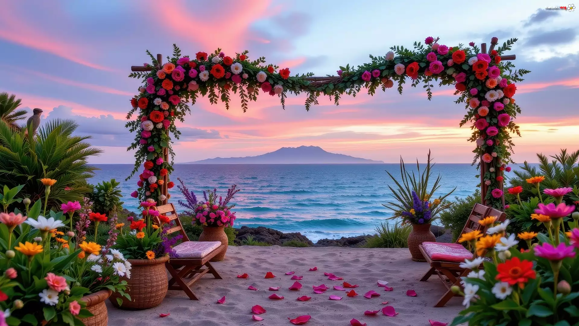 Kolorowe, Kwiaty, Krzesła, Wazony, Dekoracyjna, Brama, Plaża, Morze, Góra, Kolorowe, Niebo - Zdjęcia |
