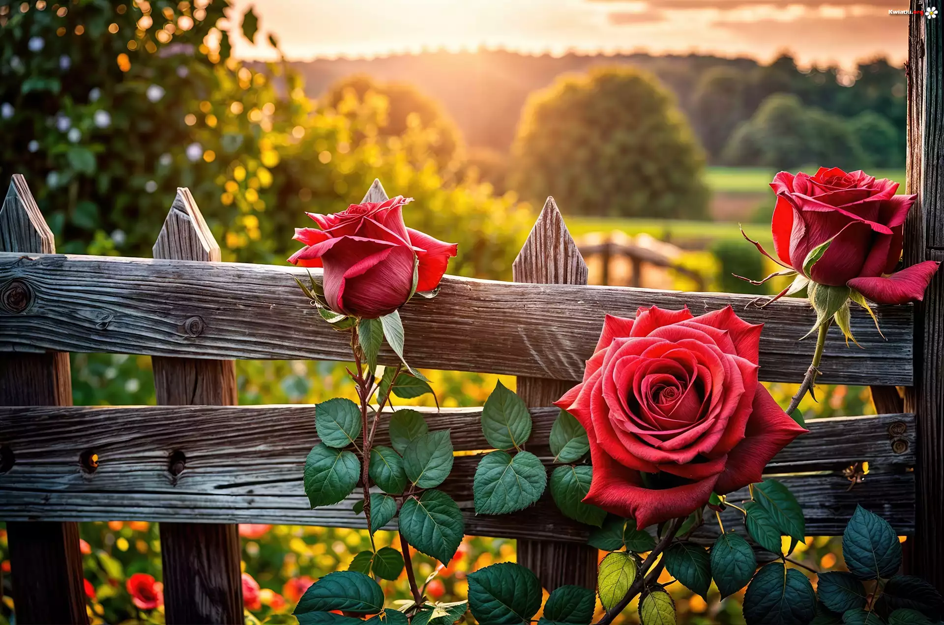 Kwiat Róże, Czerwone, Kwiaty, Płot, Zachód słońca, Grafika