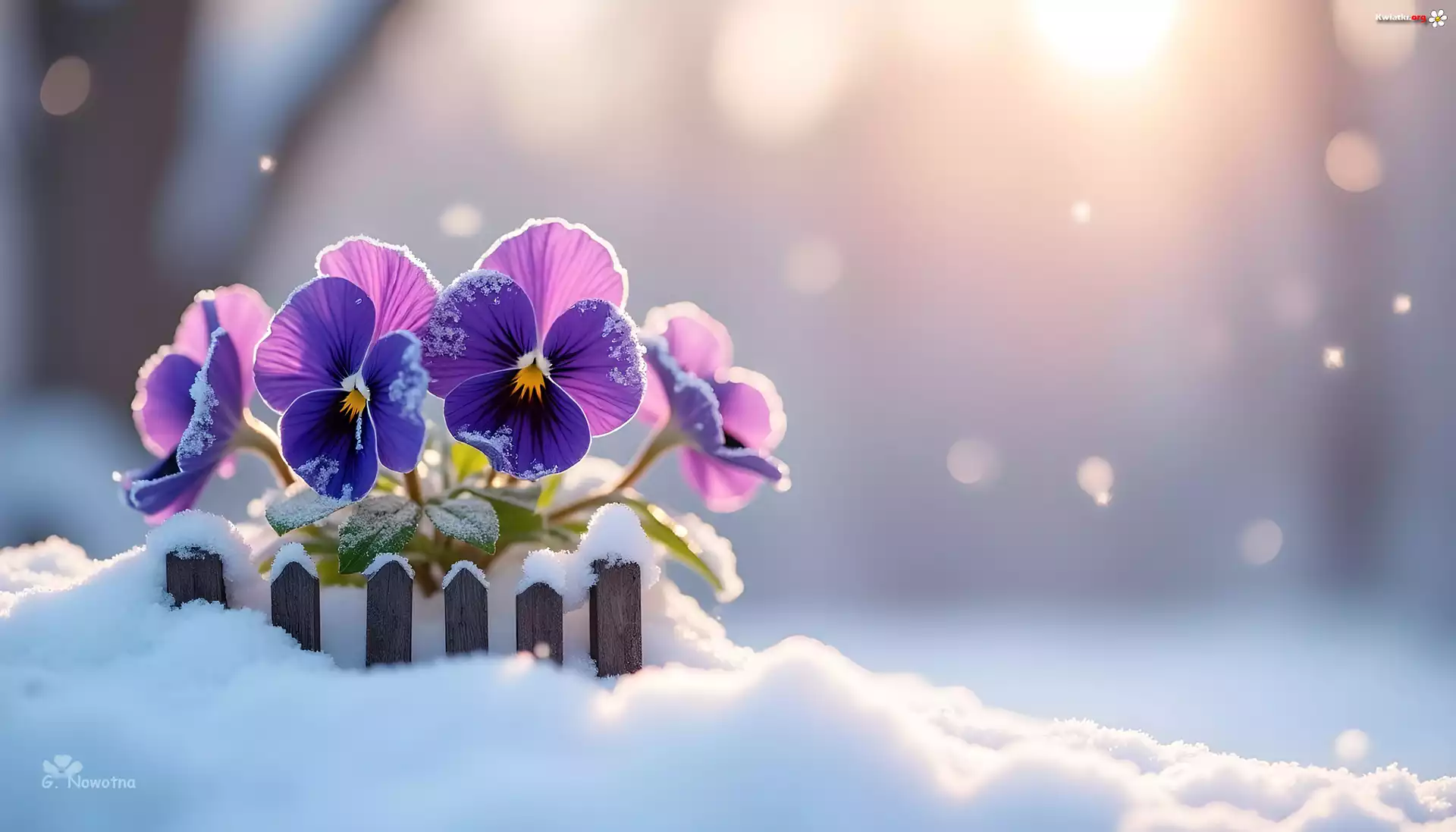 Fioletowe, Bratki, Kwiaty, Płotek, Śnieg, Zima, Grafika - Zdjęcia