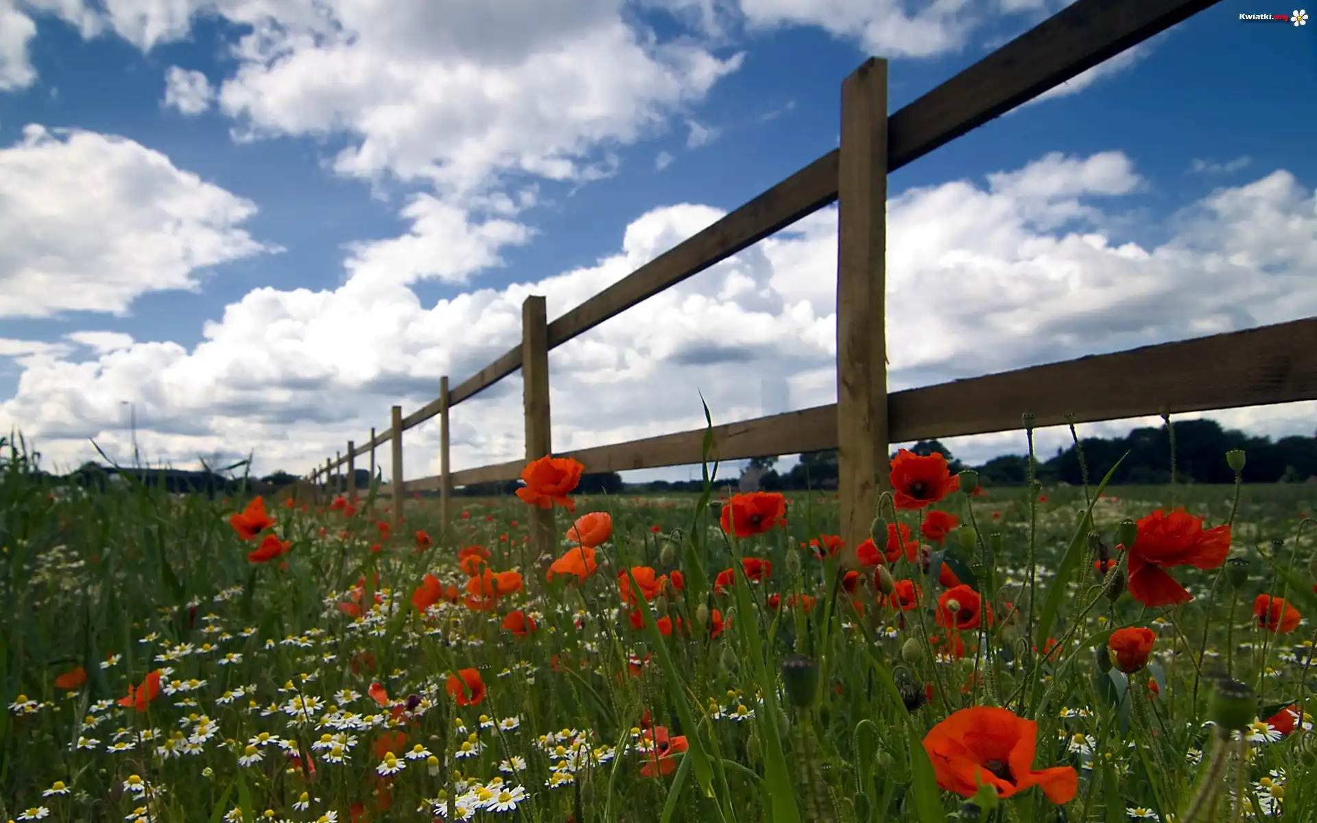 Łąka, Maki, Płotek, Chmury - Zdjęcia