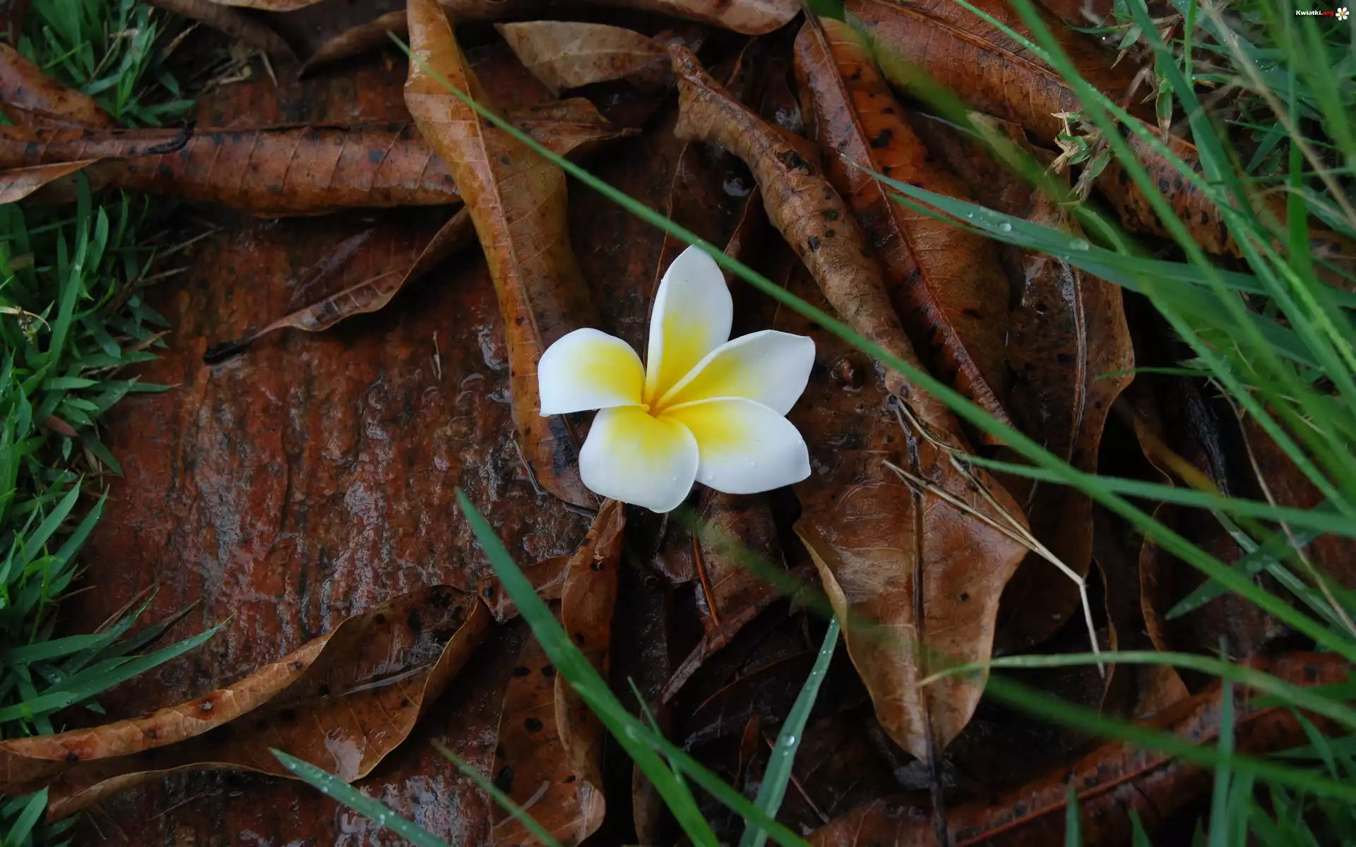 Plumeria, Kwiatek, Jesienne, Liście, Trawa - Zdjęcia