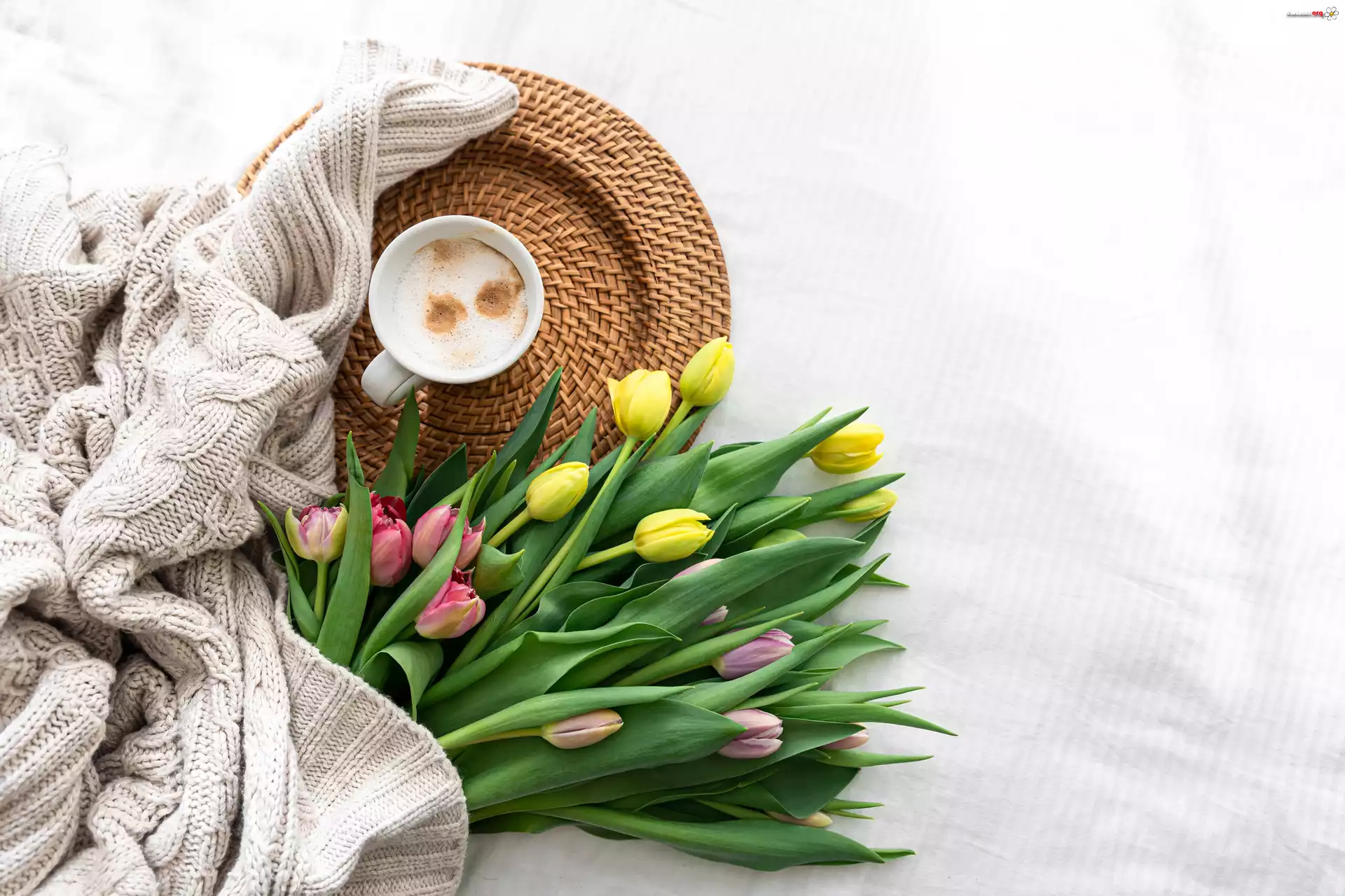 Sweter, Kwiaty, Tulipany, Podkładka, Filiżanka, Kawa, Kompozycja - Zdjęcia