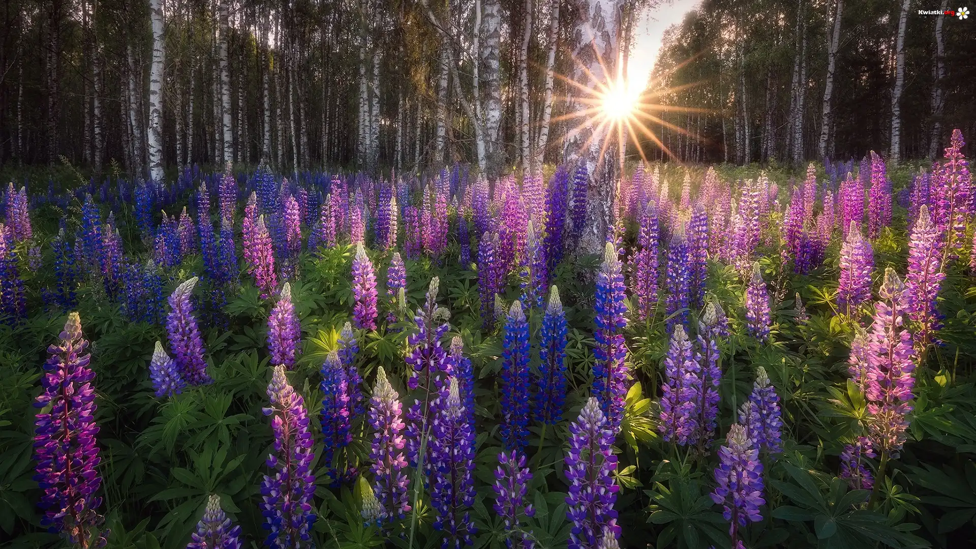 Kwiat Polska, Podlasie, Łubin, Las, Drzewa, Promienie słońca