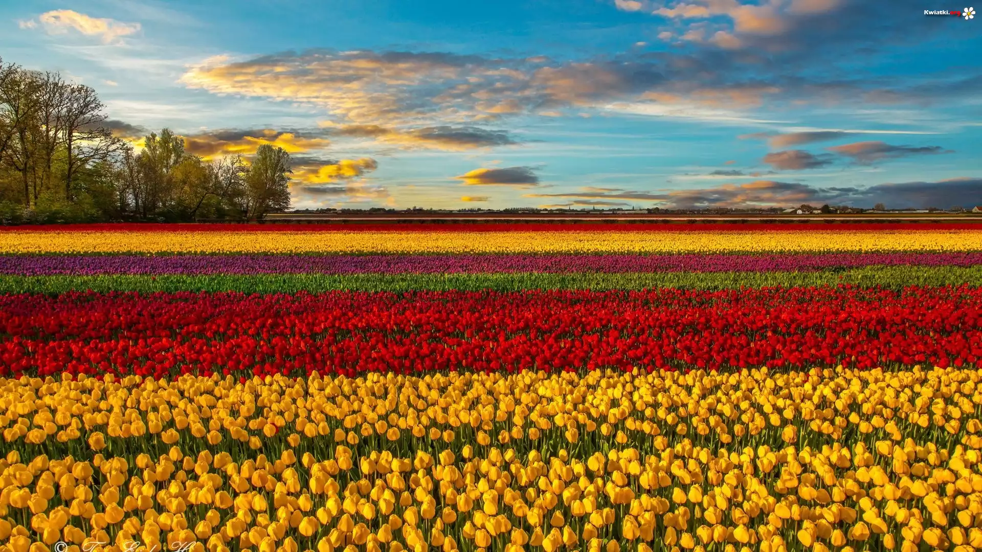 Pola, Tulipanów, Drzewa, Chmury, Horyzont - Zdjęcia