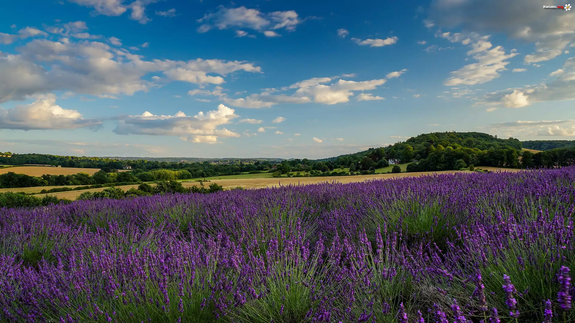 Pola, Lawenda, Dom, Drzewa, Niebo, Chmury - Zdjęcia