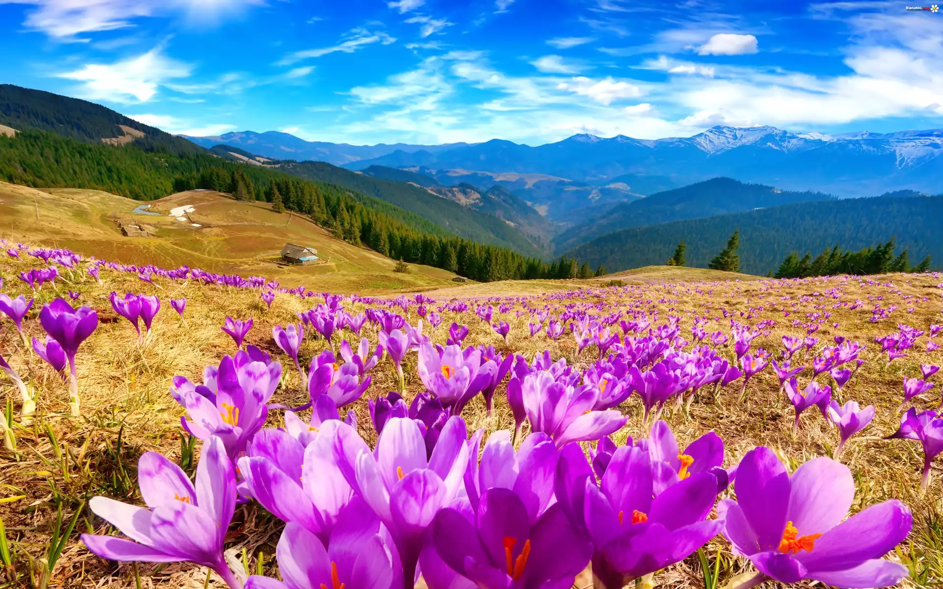Kwiat Polana, Krokusy, Góry, Lasy, Domy, Wiosna