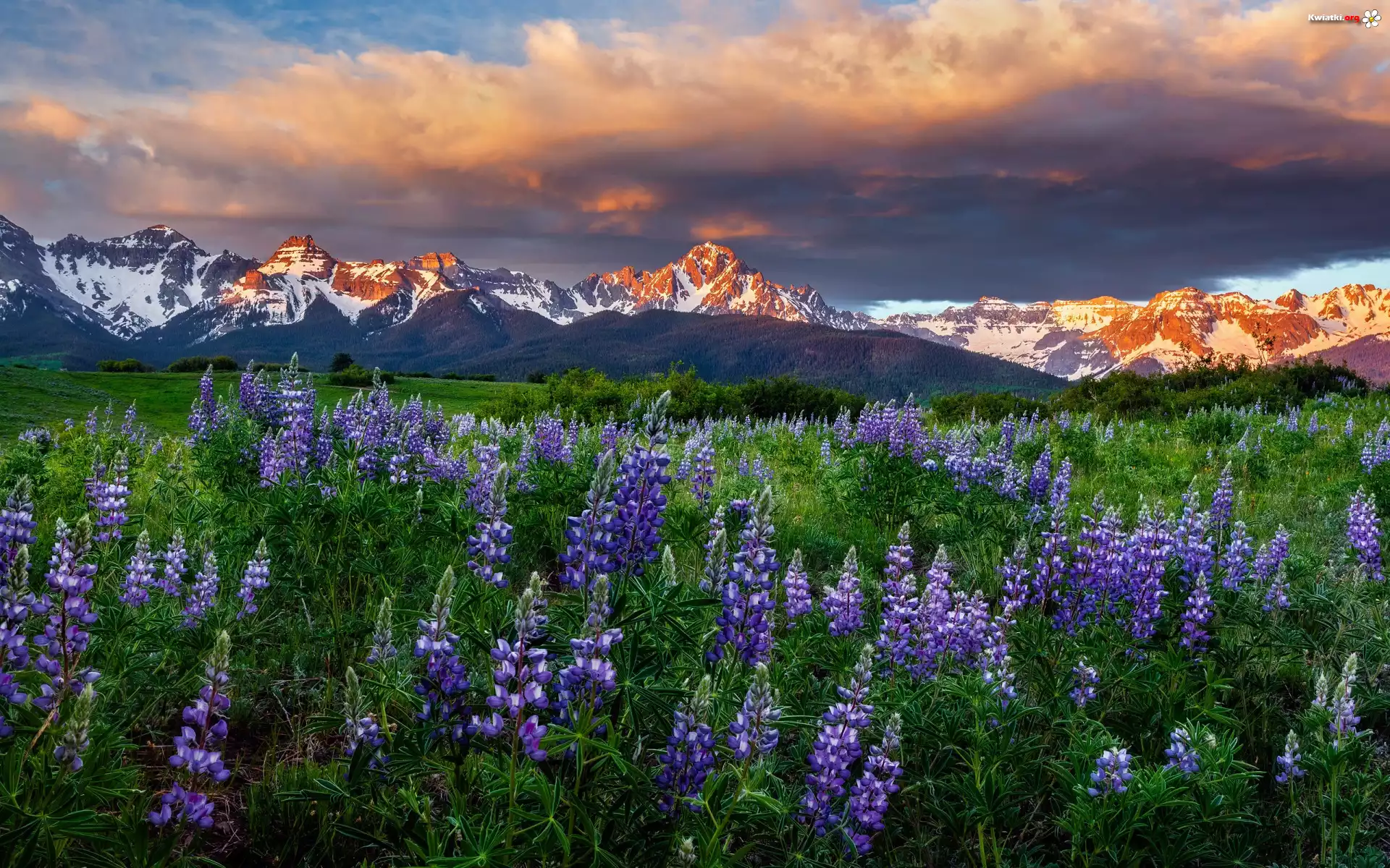 Stany Zjednoczone, Kolorado, Mount Sneffels, Góry, Kwiaty, Łubin, Polana, Chmury, Niebo - Zdjęcia