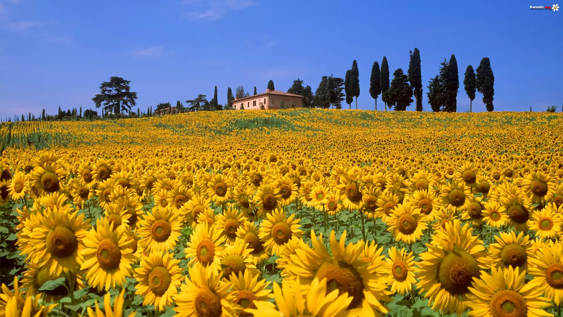 Kwiat Pole, Słoneczników, Dom, Drzewa
