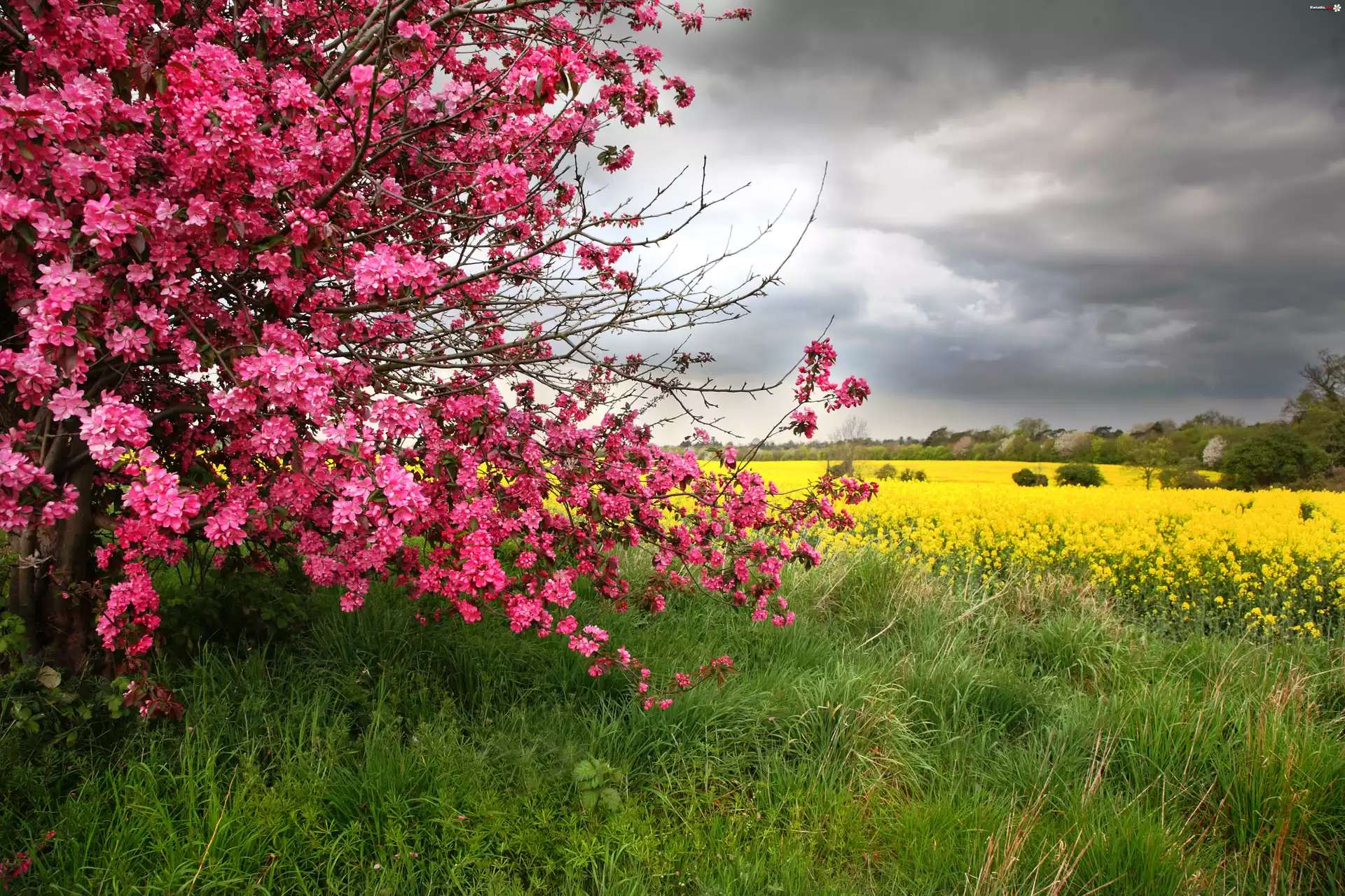 Kwiat Pole, Łąka, Trawa, Drzewa, Chmury