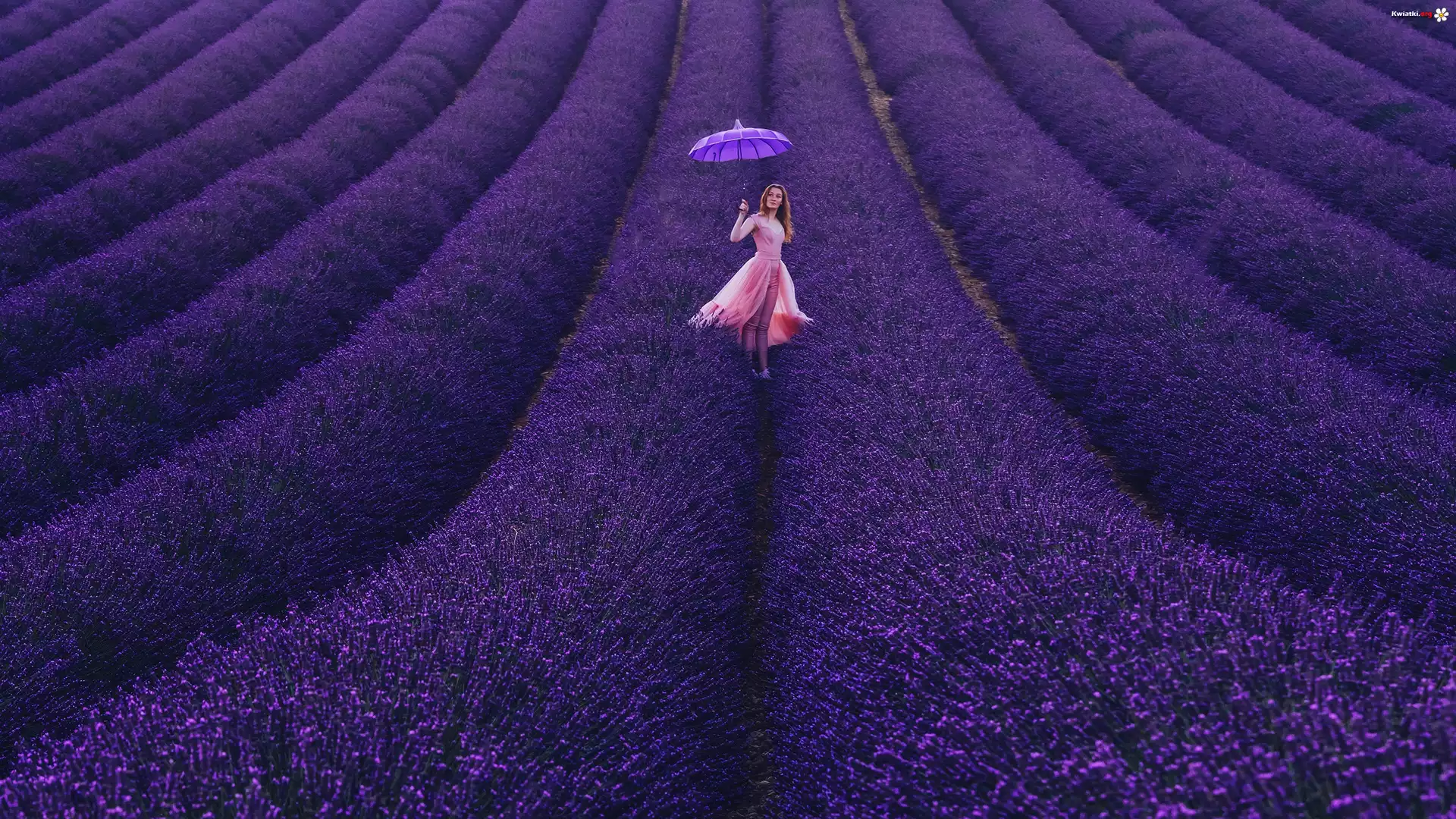 Kwiat Pole, Lawenda, Kobieta, Parasolka