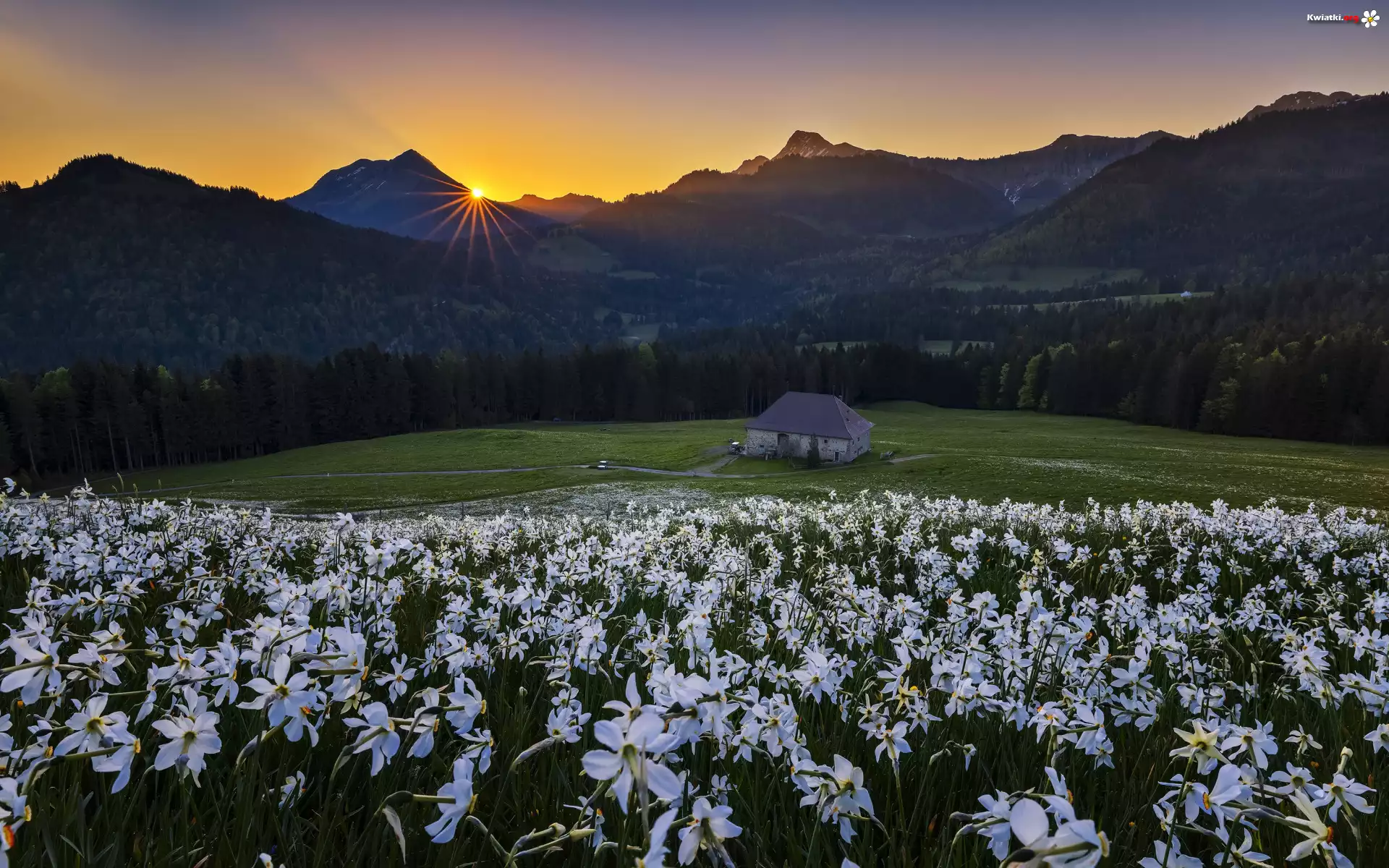 Kwiat Pole, Kwiaty, Góry, Dom, Narcyzy, Drzewa, Las, Zachód słońca