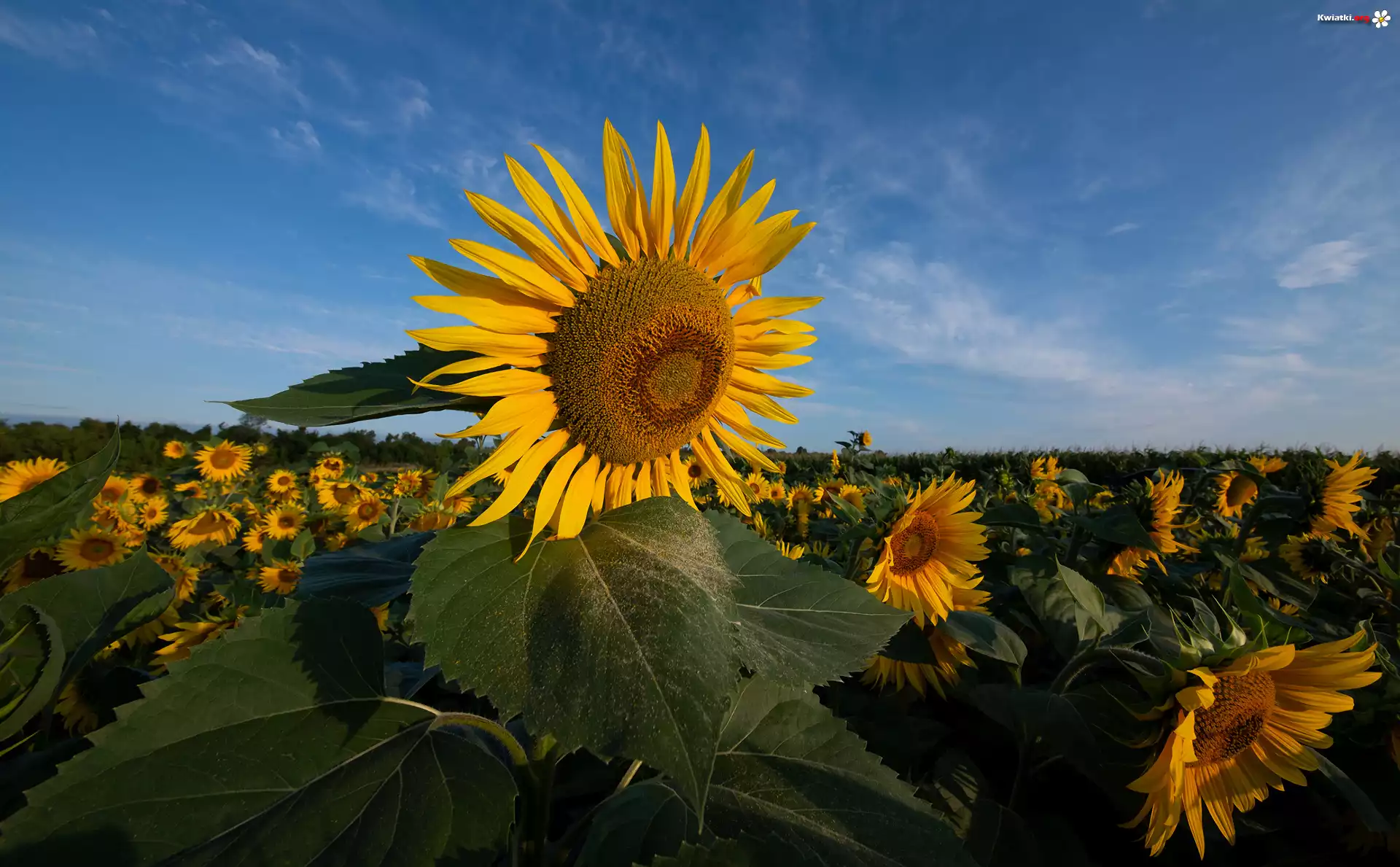Pole, Słoneczniki, Liście, Niebo - Zdjęcia