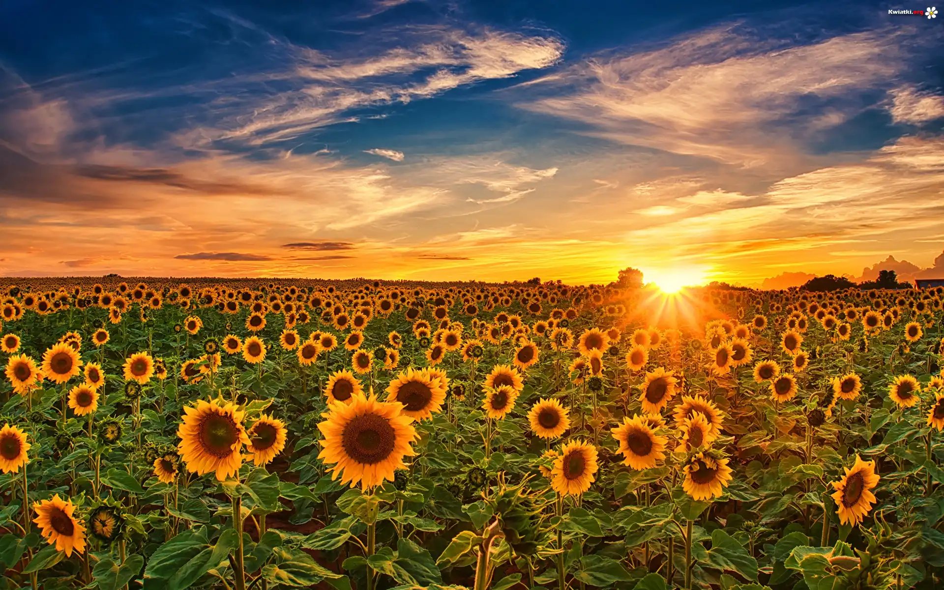 Kwiat Pole, Kwiaty, Słoneczniki, Chmury, Promienie słońca