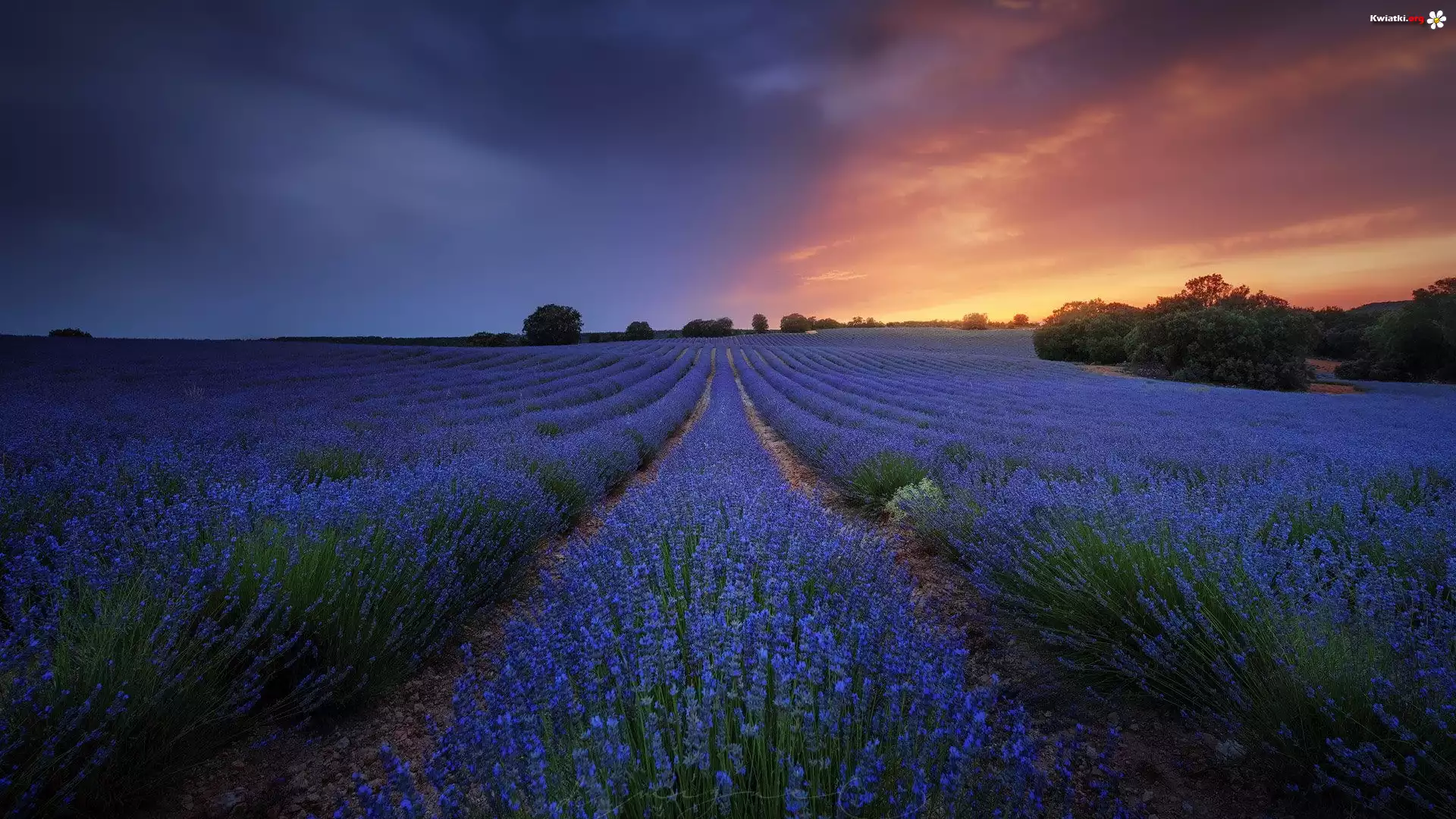 Kwiat Pole, Lawenda, Drzewa, Zachód słońca, Wieczór
