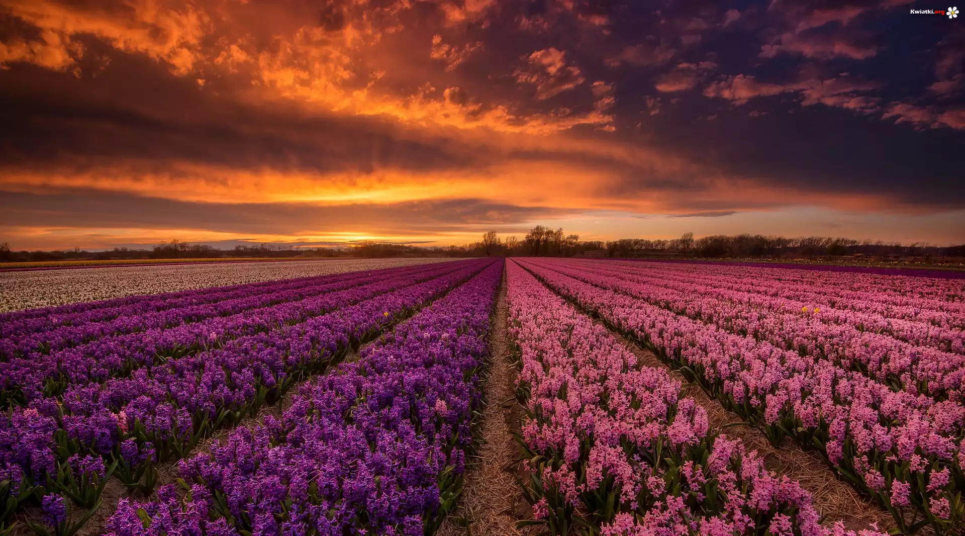 Kwiat Pole, Kwiaty, Hiacynty, Zachód słońca, Chmury