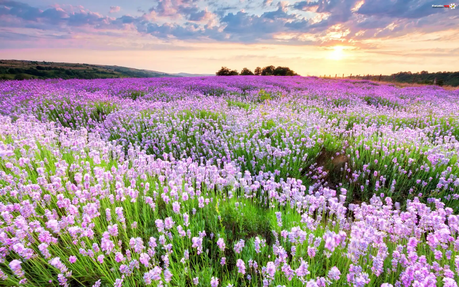 Pole, Kwiaty, Wzgórza, Zachód, Słońca, Drzewa - Zdjęcia