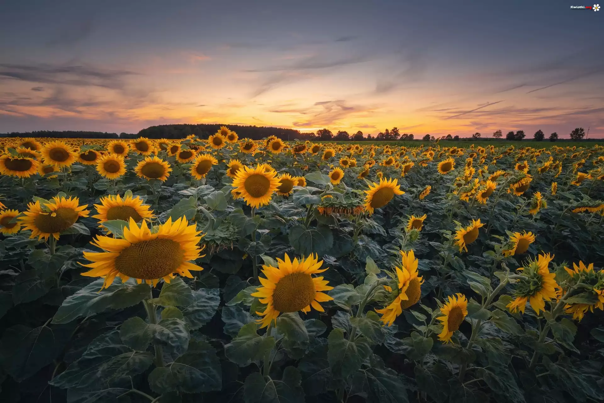 Kwiaty, Żółte, Słoneczniki, Pole, Plantacja, Zachód słońca - Zdjęcia