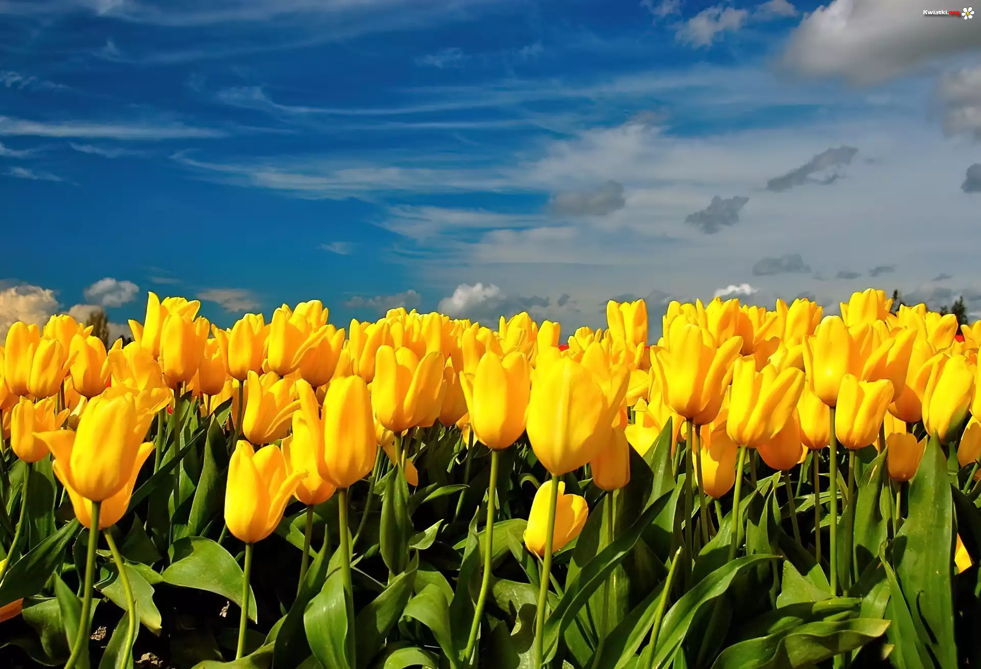 Pole, Żółtych, Tulipanów, Niebo - Zdjęcia