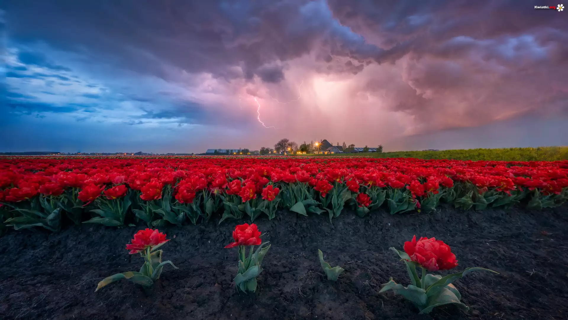 Czerwone, Pole, Tulipany, Ciemne, Chmury - Zdjęcia