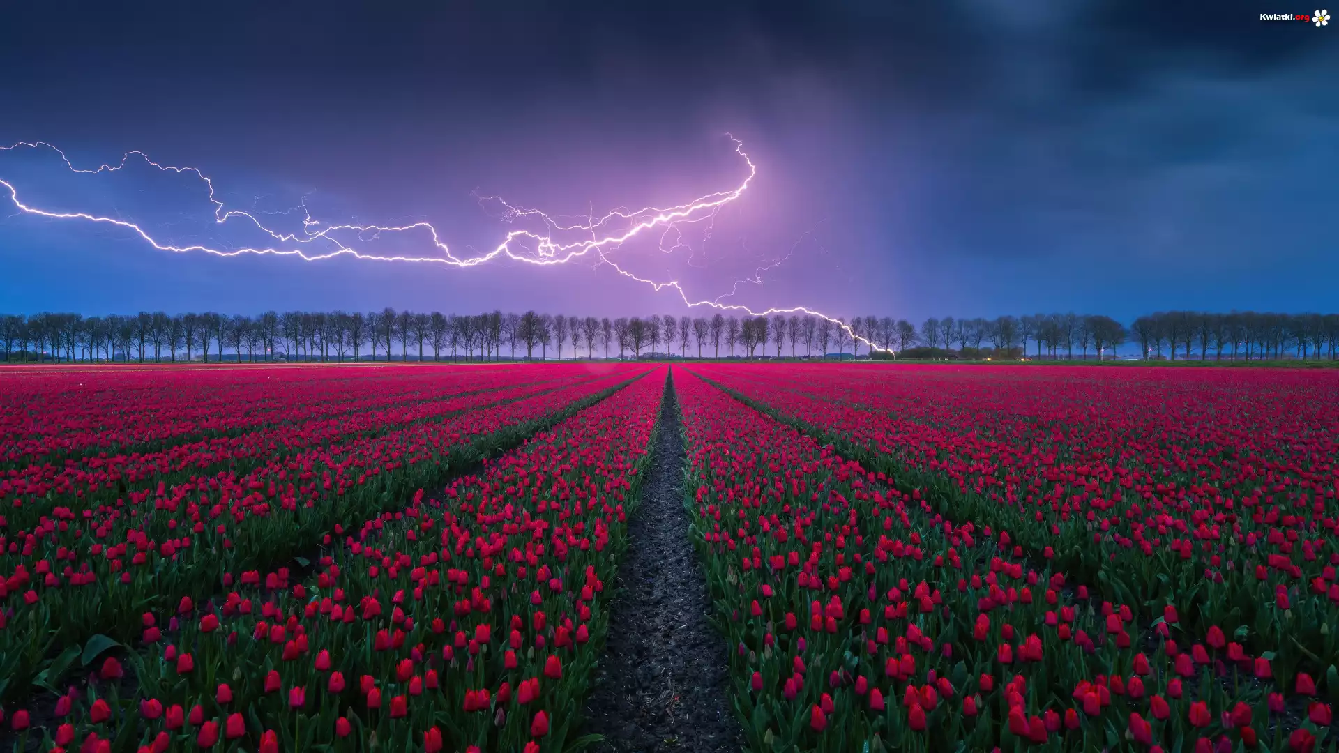 Niebo, Błyskawica, Wieczór, Pole, Kwiaty, Tulipany, Drzewa - Zdjęcia