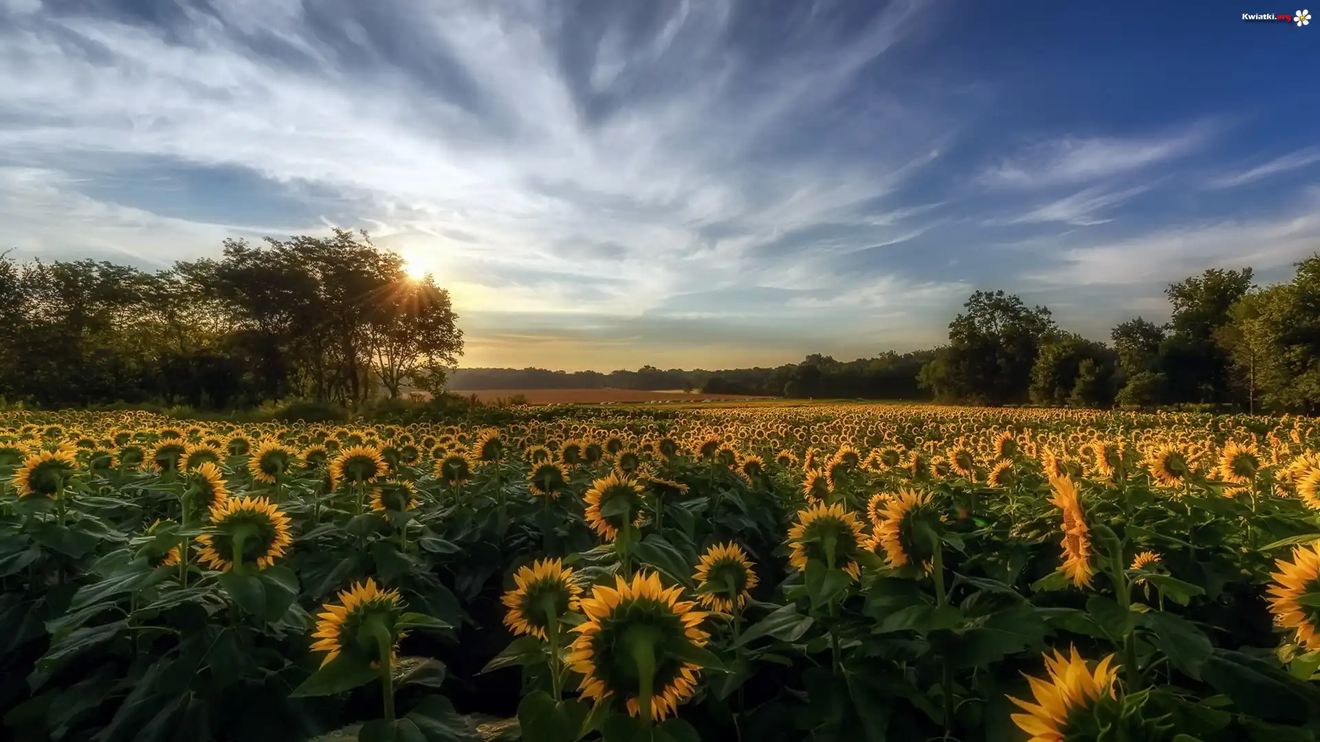 Kwiat Pole, Słoneczniki, Drzewa, Wschód słońca
