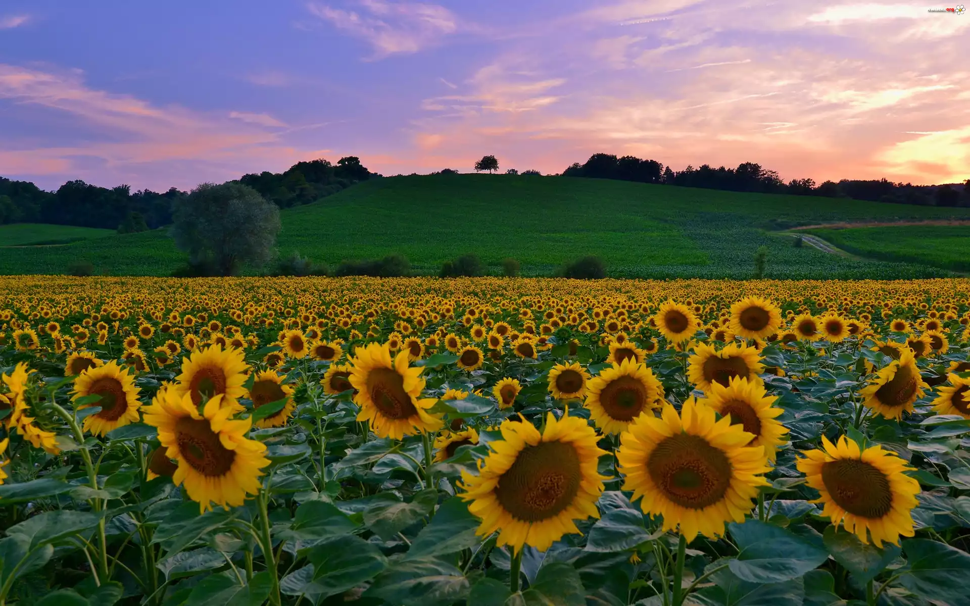 Kwiat Pole, Słoneczników, Wzgórze, Drzewa