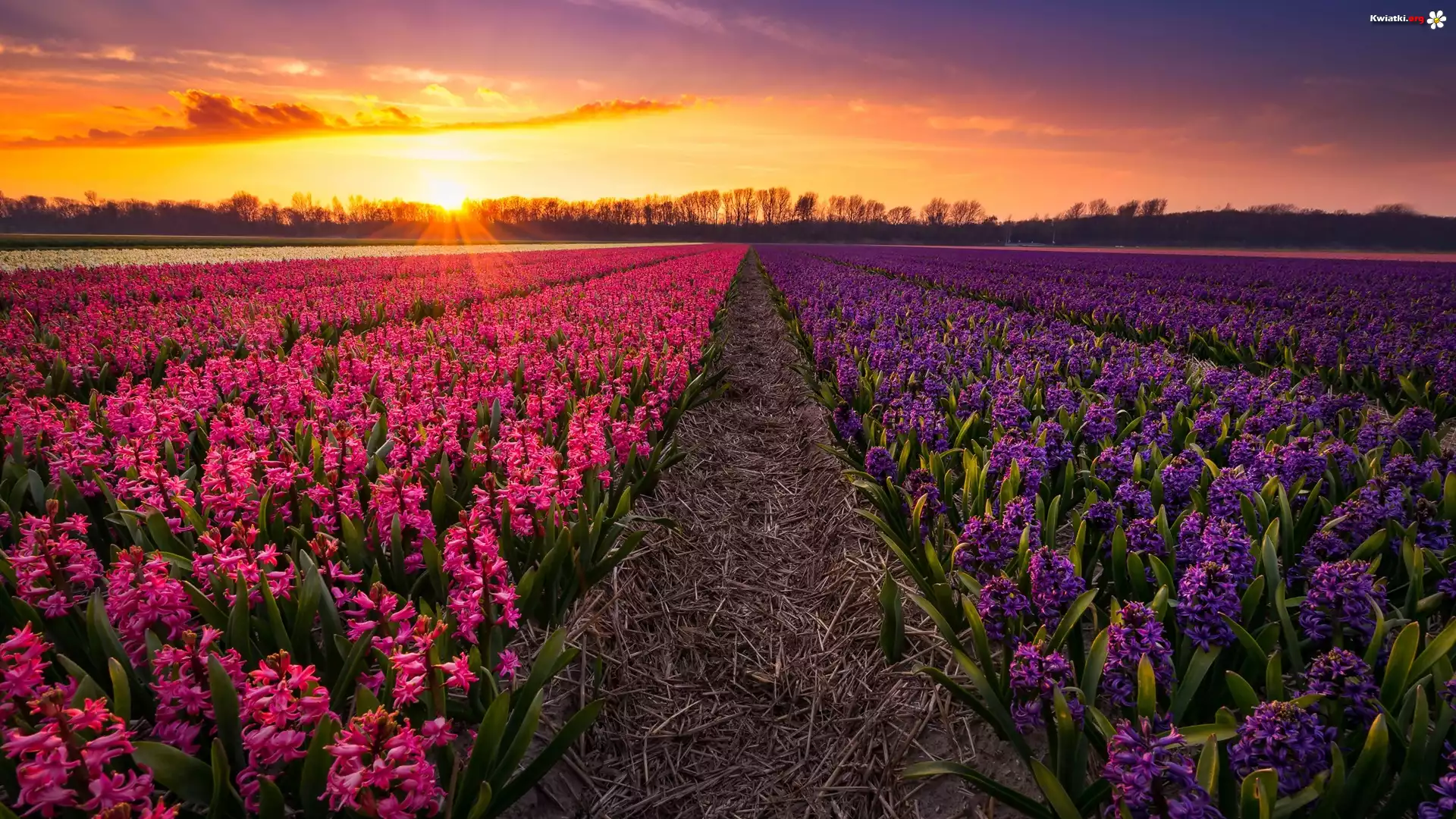 Pole, Plantacja, Hiacynty, Drzewa, Zachód słońca - Zdjęcia