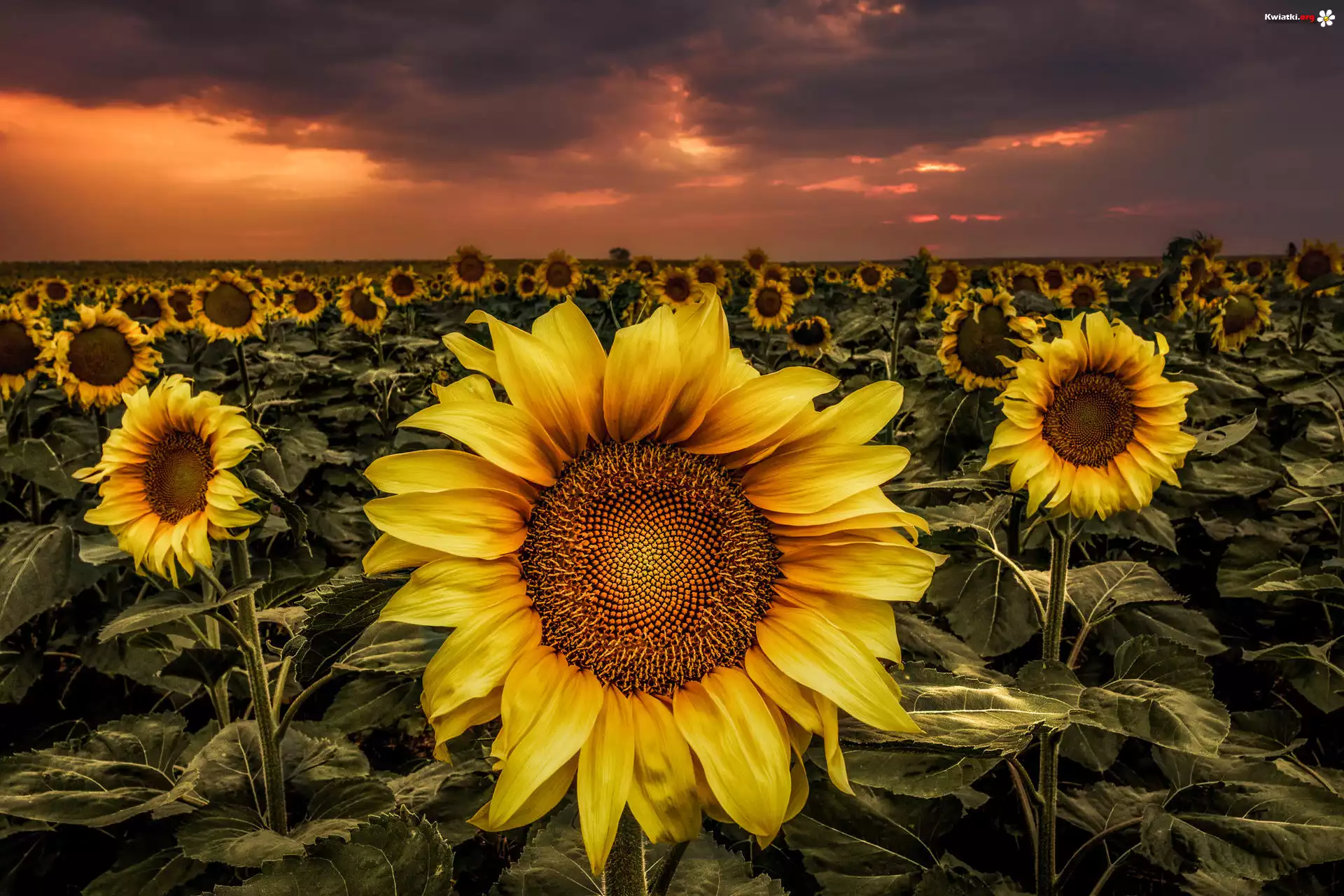 Kwiat Pole, Kwiaty, Słoneczniki, Chmury, Zachód słońca
