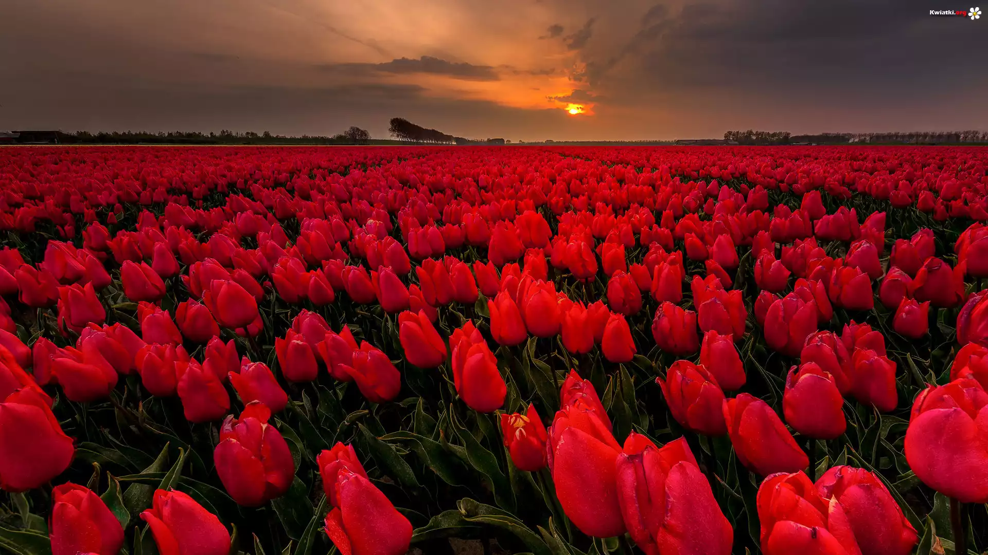 Kwiat Pole, Czerwone, Tulipany, Zachód słońca