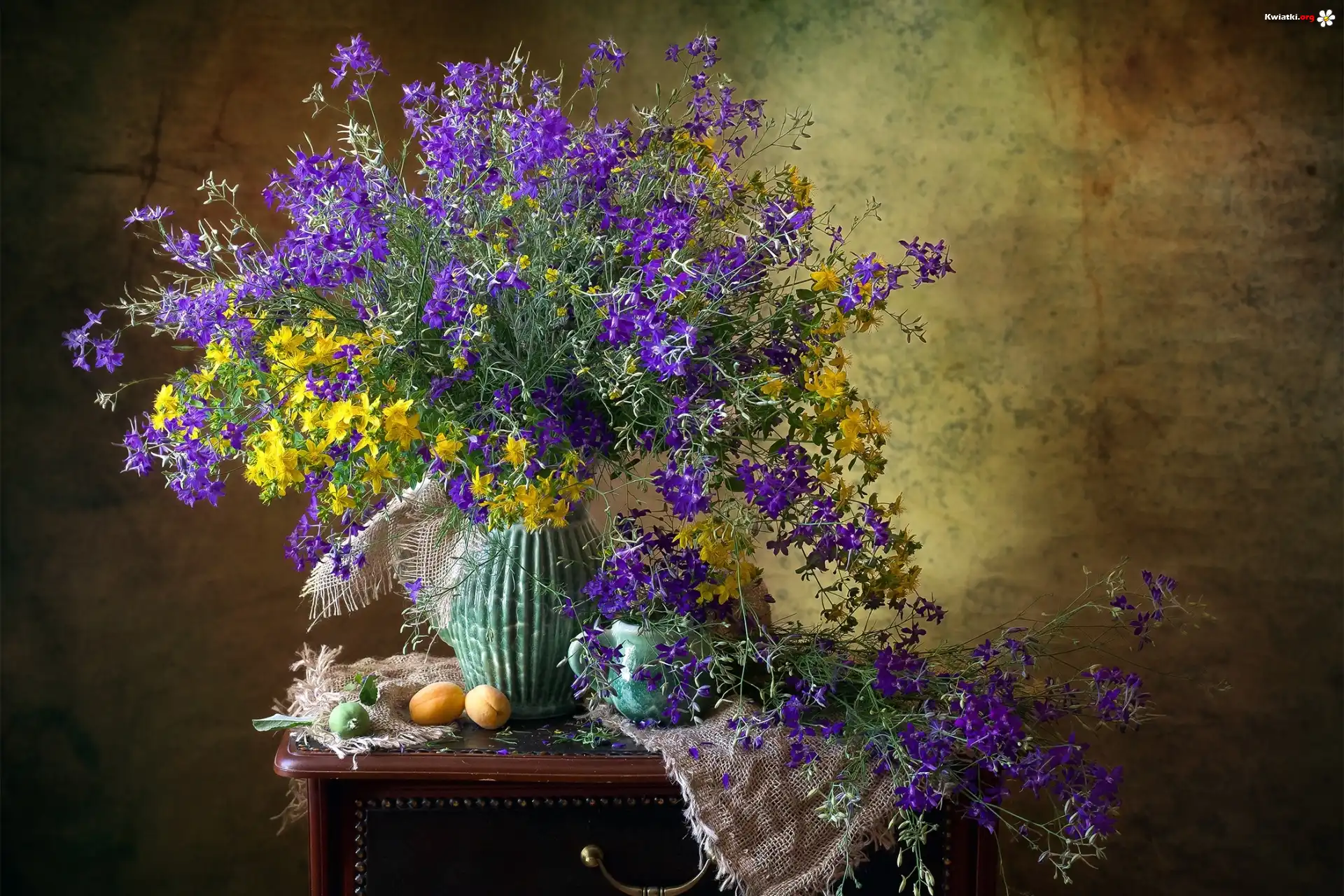 Kwiat Kwiaty, Polne, Bukiet, Wazon, Dzbanek, Komoda, Owoce