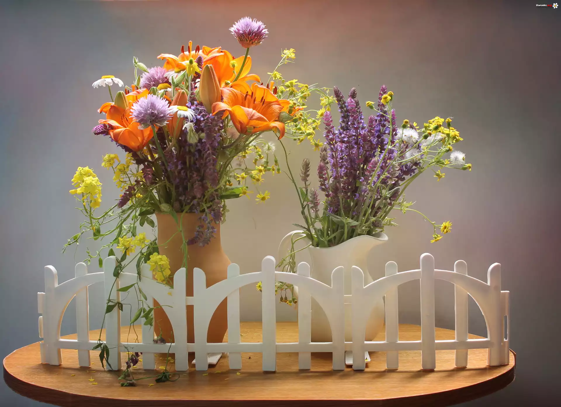 Kwiaty, Polne, Lilie, Bukiety, Wazony, Płotek, Stół - Zdjęcia