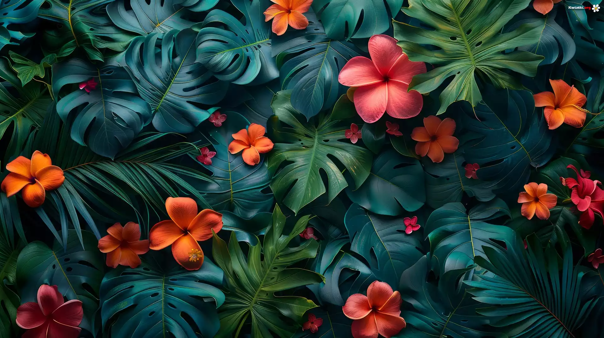 Czerwone, Pomarańczowe, Kwiaty, Liście, Monstera - Zdjęcia