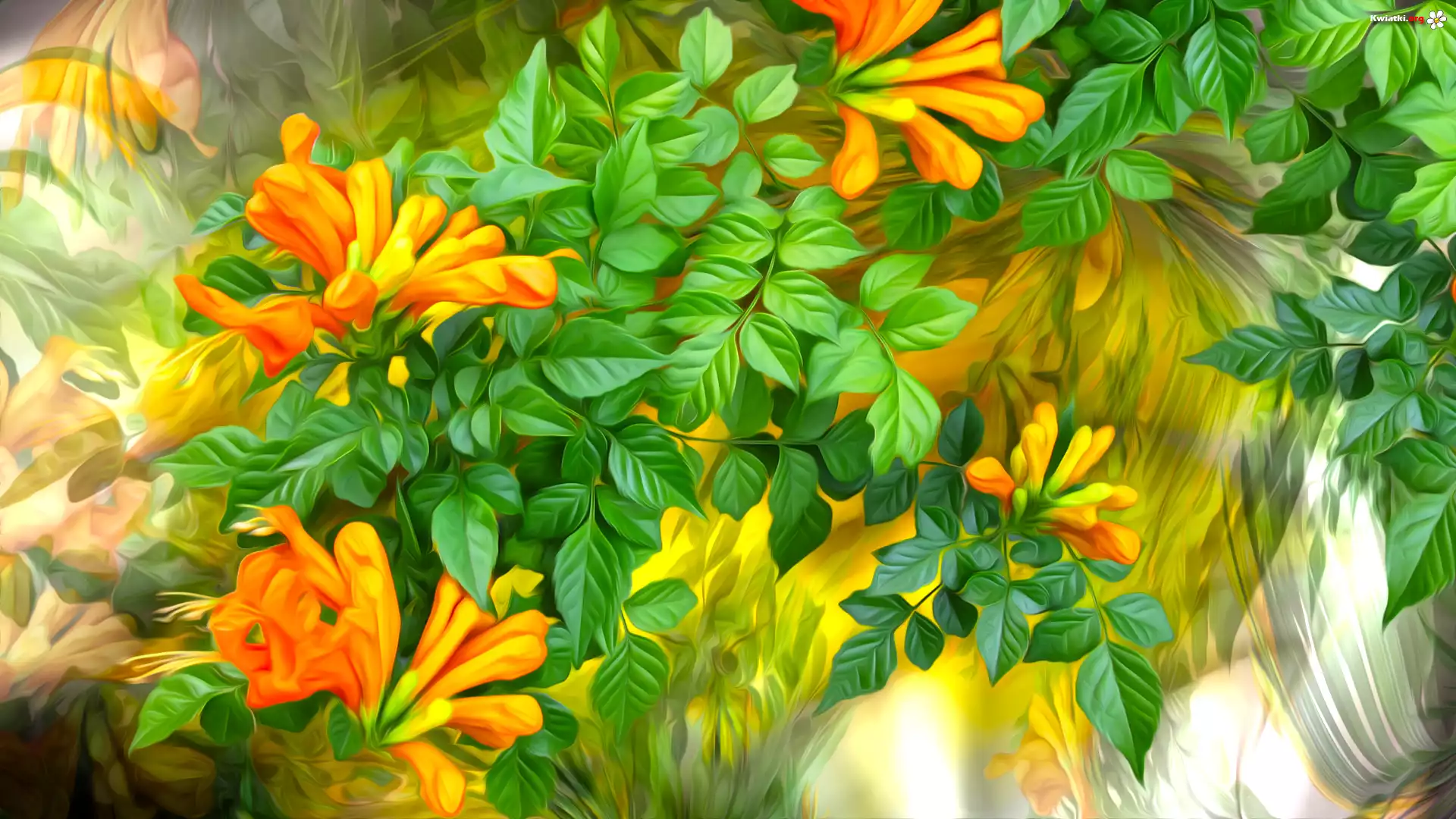 Pomarańczowe, Kwiaty, Liście, Grafika - Zdjęcia