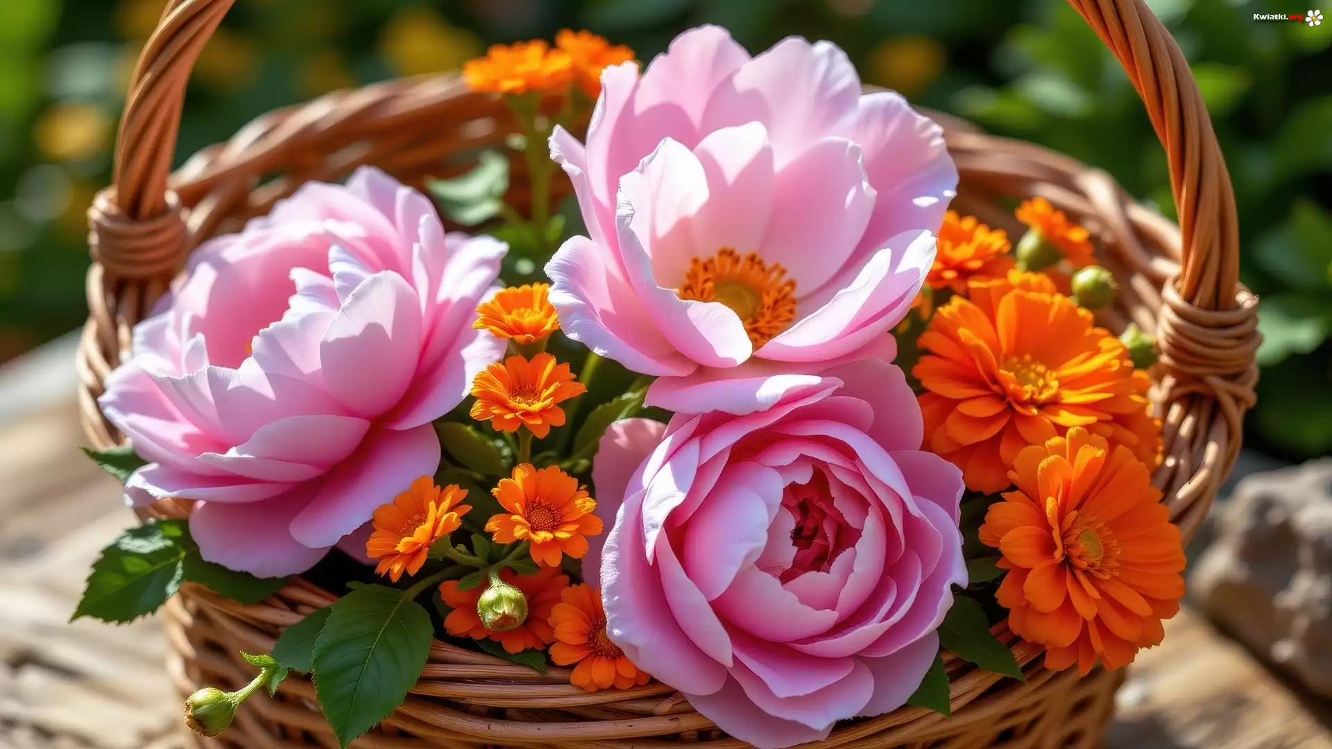 Kwiaty, Różowe, Piwonie, Pomarańczowe, Nagietki, Wiklinowy, Koszyk - Zdjęcia