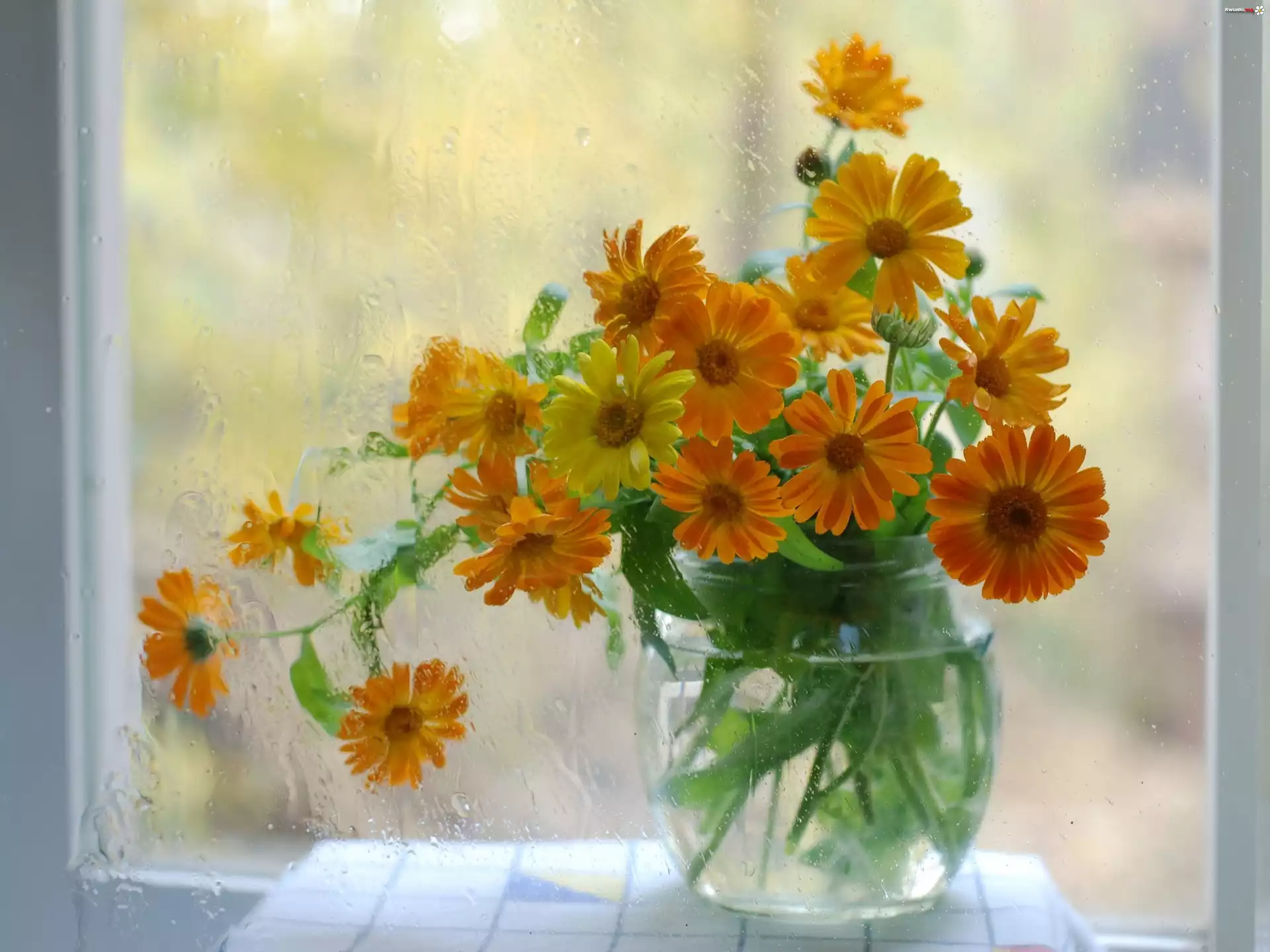 Pomarańczowe, Margarytki, Szyba, Deszcz - Zdjęcia