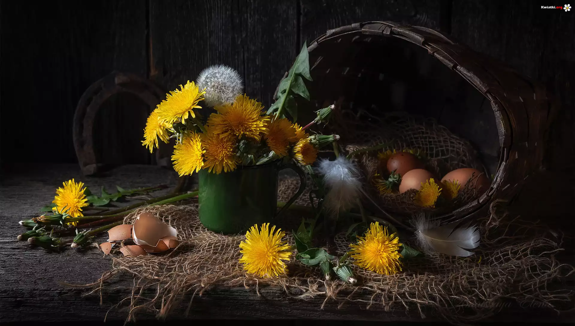 Kompozycja, Kwiaty, Mniszki pospolite, Jajka, Koszyczek, Skorupki - Zdjęcia