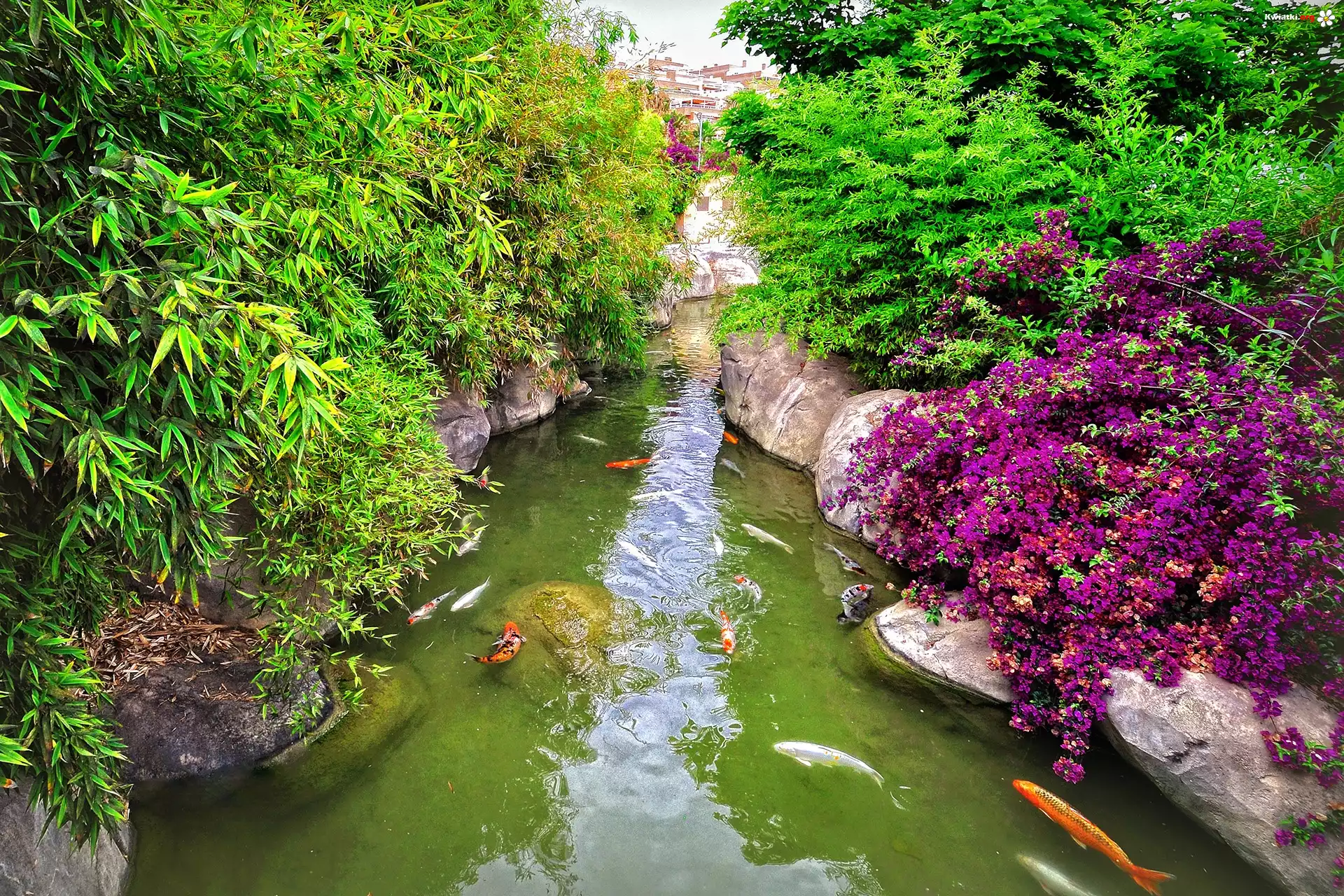 Potok, Ryby, Skały, Krzewy, Kwiaty - Zdjęcia